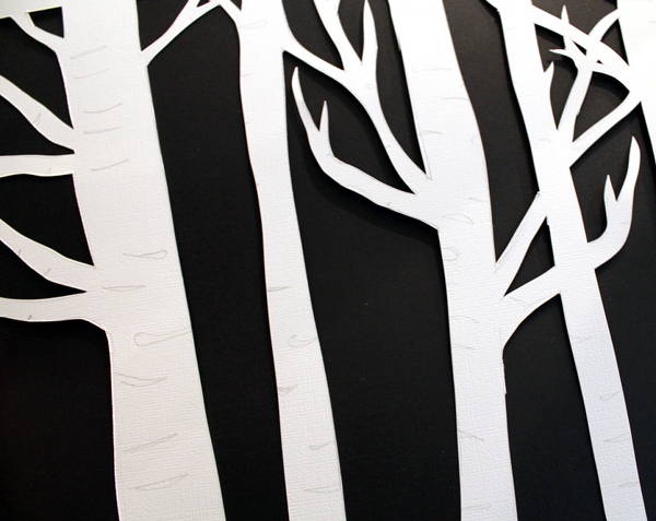 We've used the Mascils with inks, paints, embossing pastes…but how about as a cutting pattern? Before I had a diecutting machine, I used to love fussy cutting designs out for my layouts. I decided I wanted the birch trees in the Trees Mascil be white with pattern paper in the background. In order to create that effect, I had to cut out the trees. Laying the Mascil down on the cardstock, trace the stencil completely. Using an exacto knife cut out the design. I didn't cut out the spots on the tree trunks, but instead used them as markers showing me where to add color.