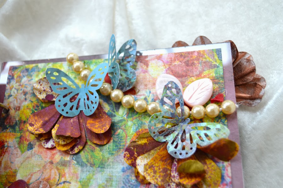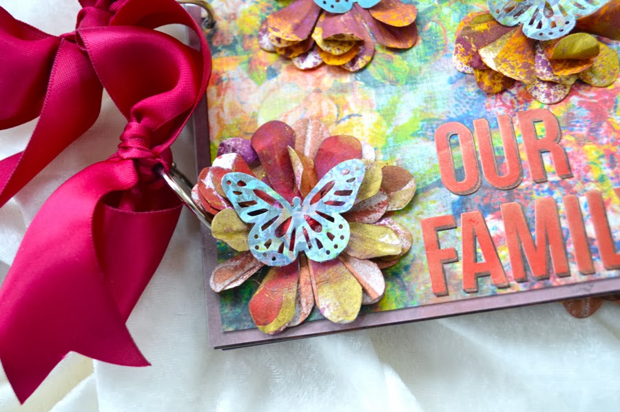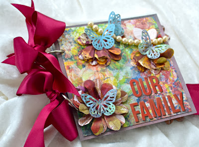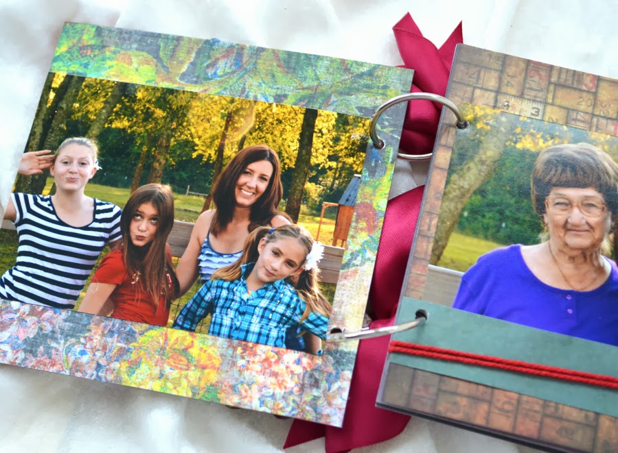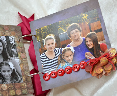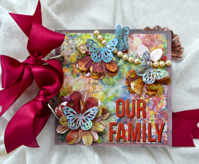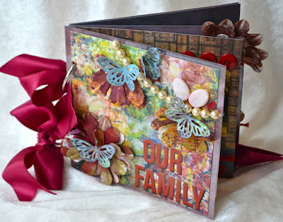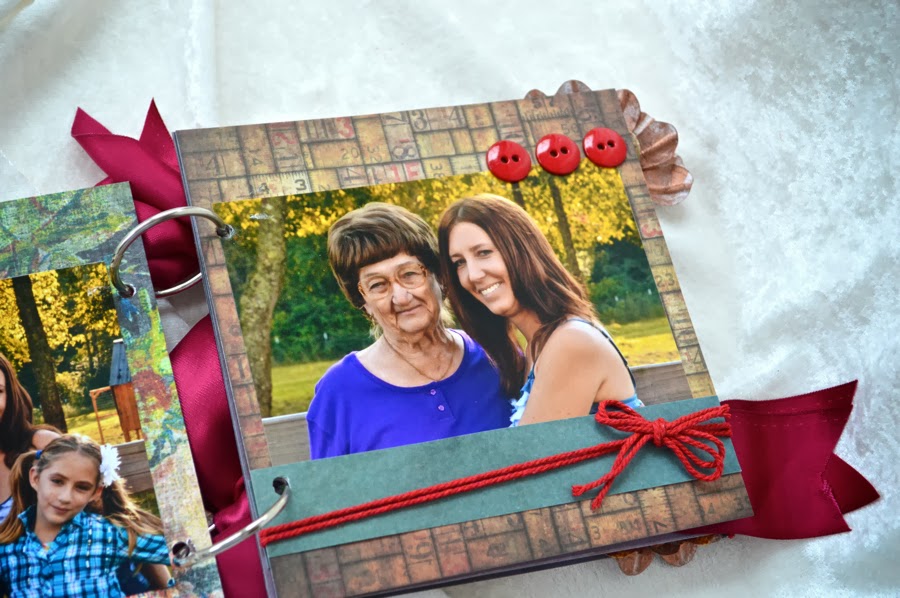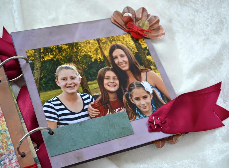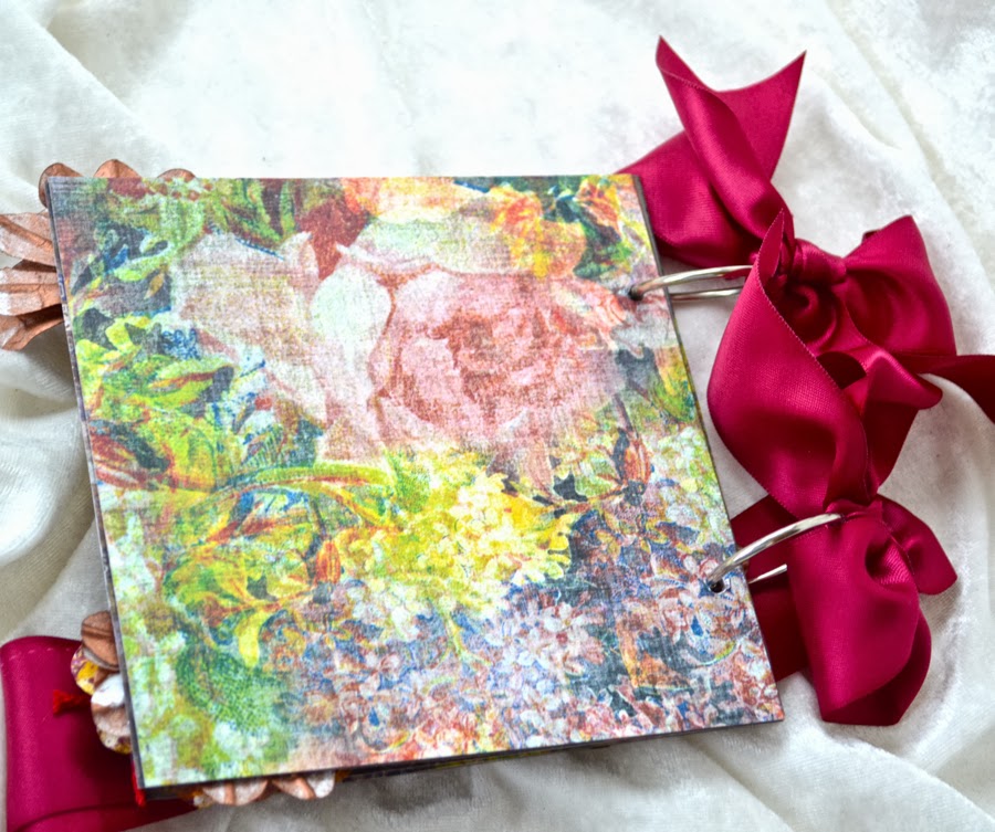 This mini album was created using a Clear ScrapsAcrylic 8X8 Regular Album, Clear Scraps flowers, Ribbons Unlimited Ribbon, Tim Holtz papers,