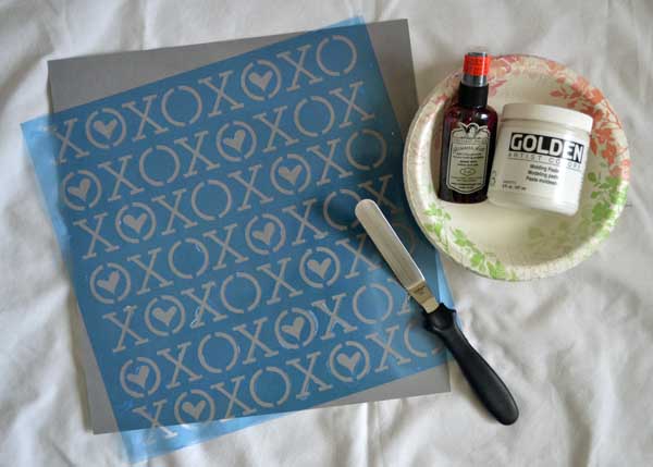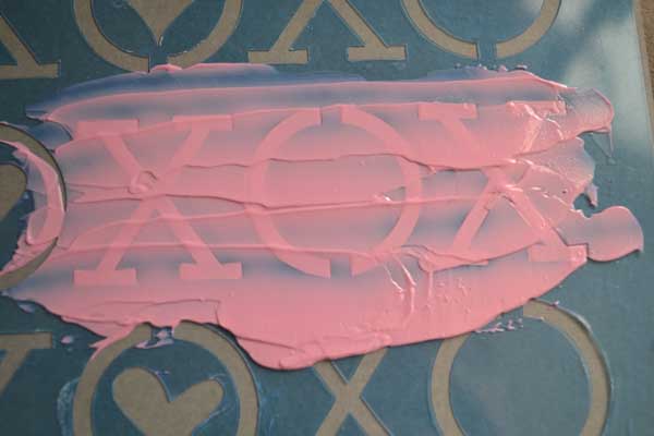 Spread over the area of the mask that you want on your patterned paper. Make sure you get the paste in all the areas of the mask. Don't worry about the coverage being even. It gives it a dimensional look. Peel it off carefully and let it dry before you finish up your project.