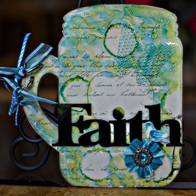 I used the Acrylic Expression Small-Faith title. Spray painted it in black. The cover page was colored with alcohol inks and light patterned paper for backing.