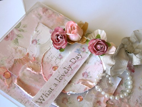 The front page was painted with Dimensional paint and misted with shimmering mists ( by Shimmerz), and embellished with the papers and pearls.