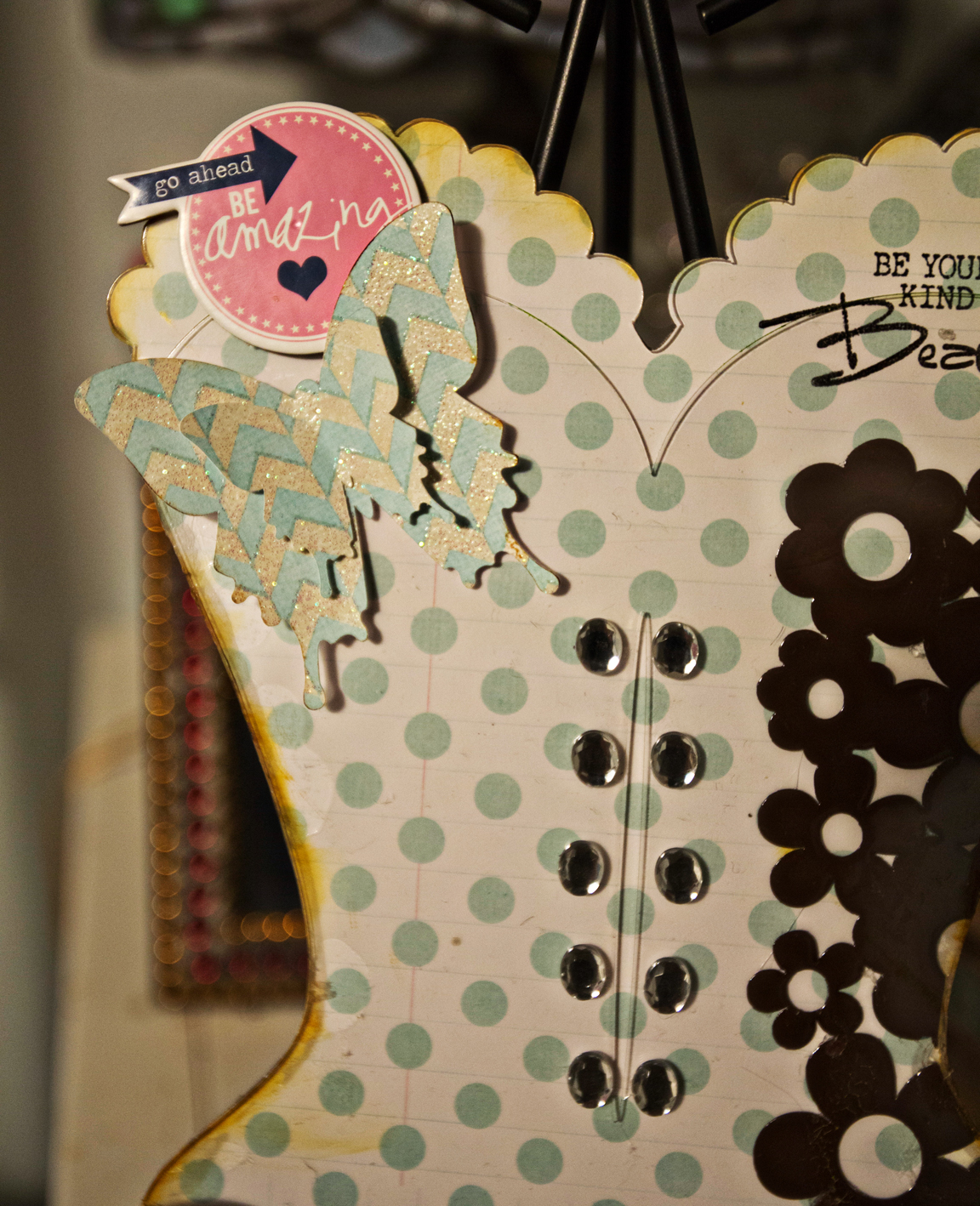 Start with tracing and cutting the shape onto a patterned paper, stamp the sentiment and ink the edges of both the paper and the acrylics. Add few embellishments, alos used the flower mascils to embellish the page. Other supplies used; Heidi Swapp, Stazon and Beacon All purpose adhesive glue.