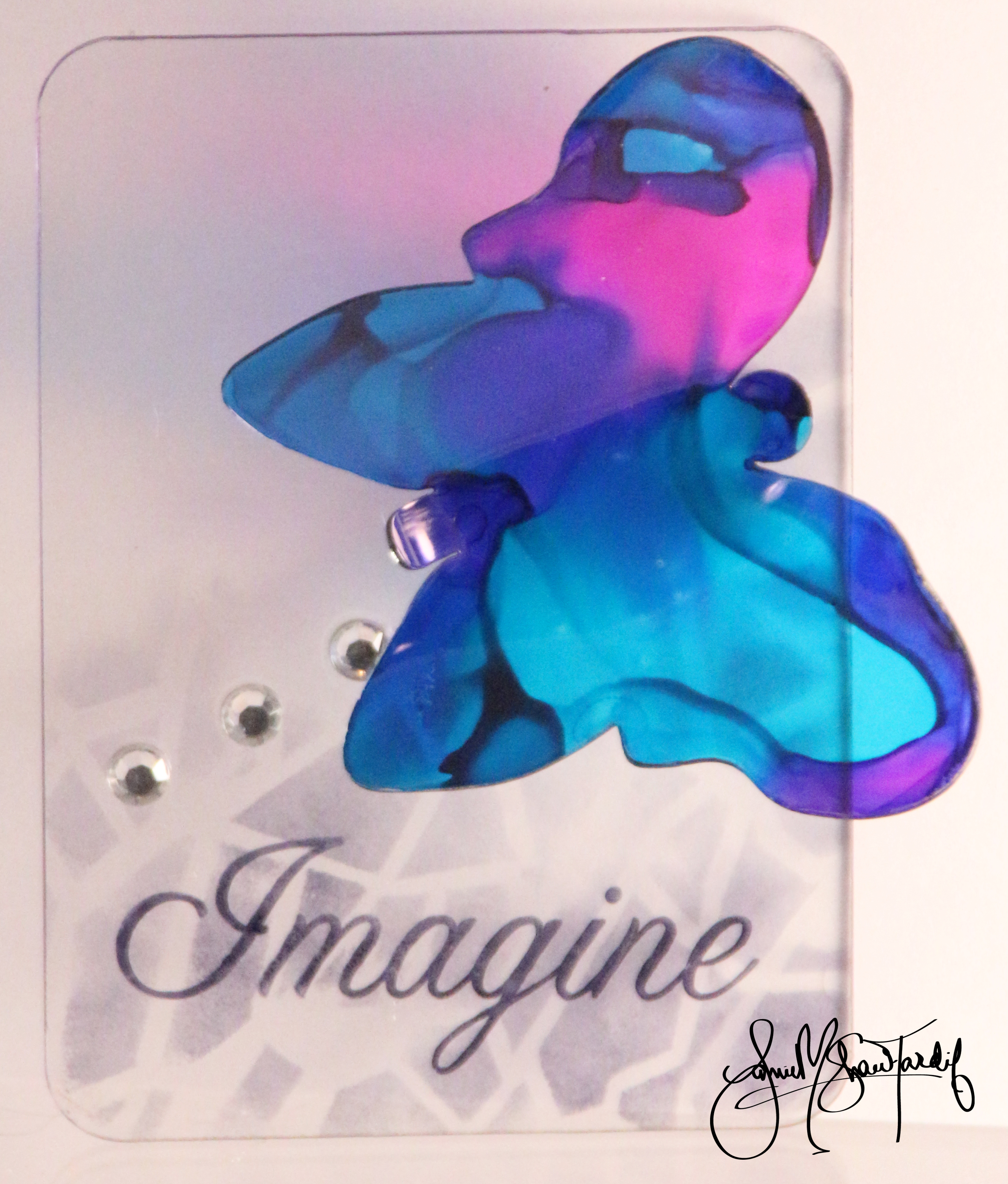 To start with, the add a little bit of definition to the clear card I used the Shattered Glass stencil along with some Archival Black Ink from Ranger to create the simple, translucent background. To create the rainbow Butterfly Embelishment I used two Ranger Alcohol Inks – Wild Plum and Stream. I simply placed two drops of each randomly on the butterfly allowing the ink to spread. I then used my heat gun to spead and mix the colors even more. The trick to using the heat gun is knowing when to stop. If you can see it in the picture – you will notice that the edges curled on the butterfly, but it gives it a wonderful organic look. I then stamped the word "imagine" from an unknown stamp set, and then adhered three tiny rhinestones using Glossy Accents – which is perfect for clear projects!