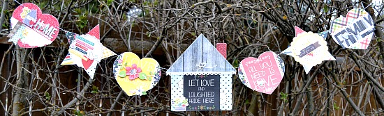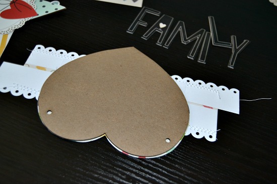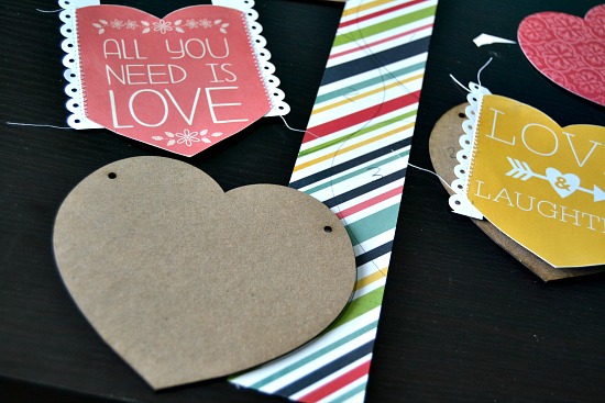 I am all about stretching my paper and adding details so, I will share a few ways that I do this. For the hearts, I wanted them each to be unique, yet have a little bit of cohesiveness. I began by cuting some word cards down for two of the heart. I added some white punched cardstock edging, then machine stitched along the edge. I also wanted to cover the arrow on the yellow portion in the middle, so I fussy cut a flower out of the pp and pop-dotted it to the middle (see above photo of finished product).