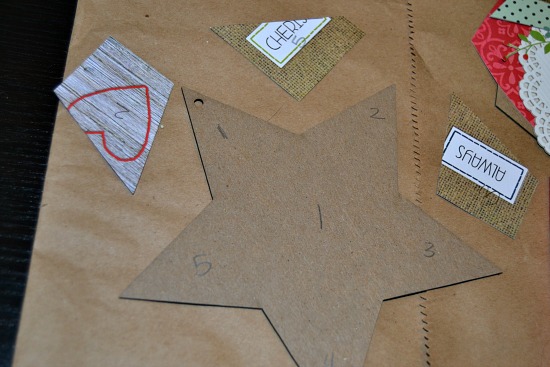 Next. I cut a strip of pp wide enough to accomodate the edges of the hearts. I then traced each heart, cut out, then adhered. (You'll notice some writing and numbers; this is something I do just to help me know which piece belongs to what. I have found this has been beneficial especially if I have to walk away from my project.)