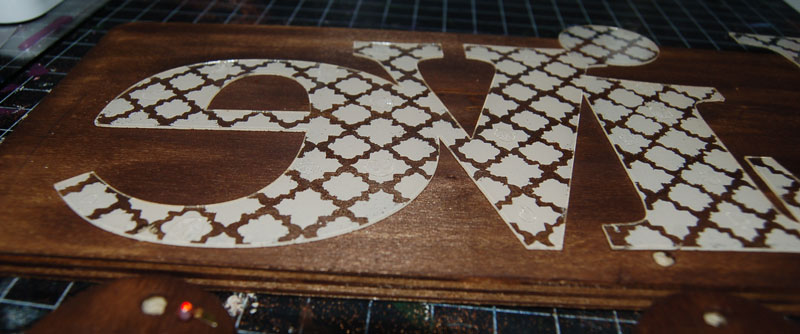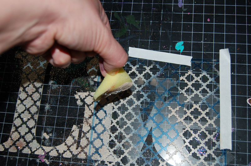 You will only be able to do a portion of the word at at time. Gently lift the stencil and carefully align it with the spot where the first portion ended. I used a bit of artists tape to hold the stencil in place. Gently dap the remainder with the acrylic paint using the sponge. While the paint is still wet, add a little shimmer by sprinkling fine glitter over the entire piece.