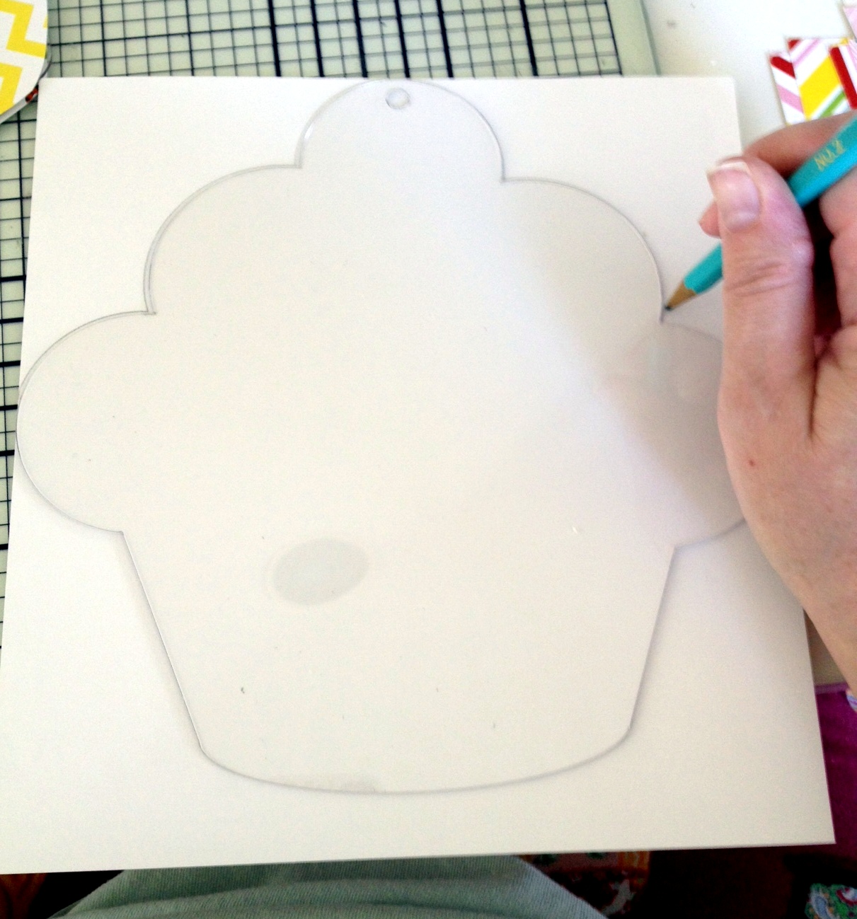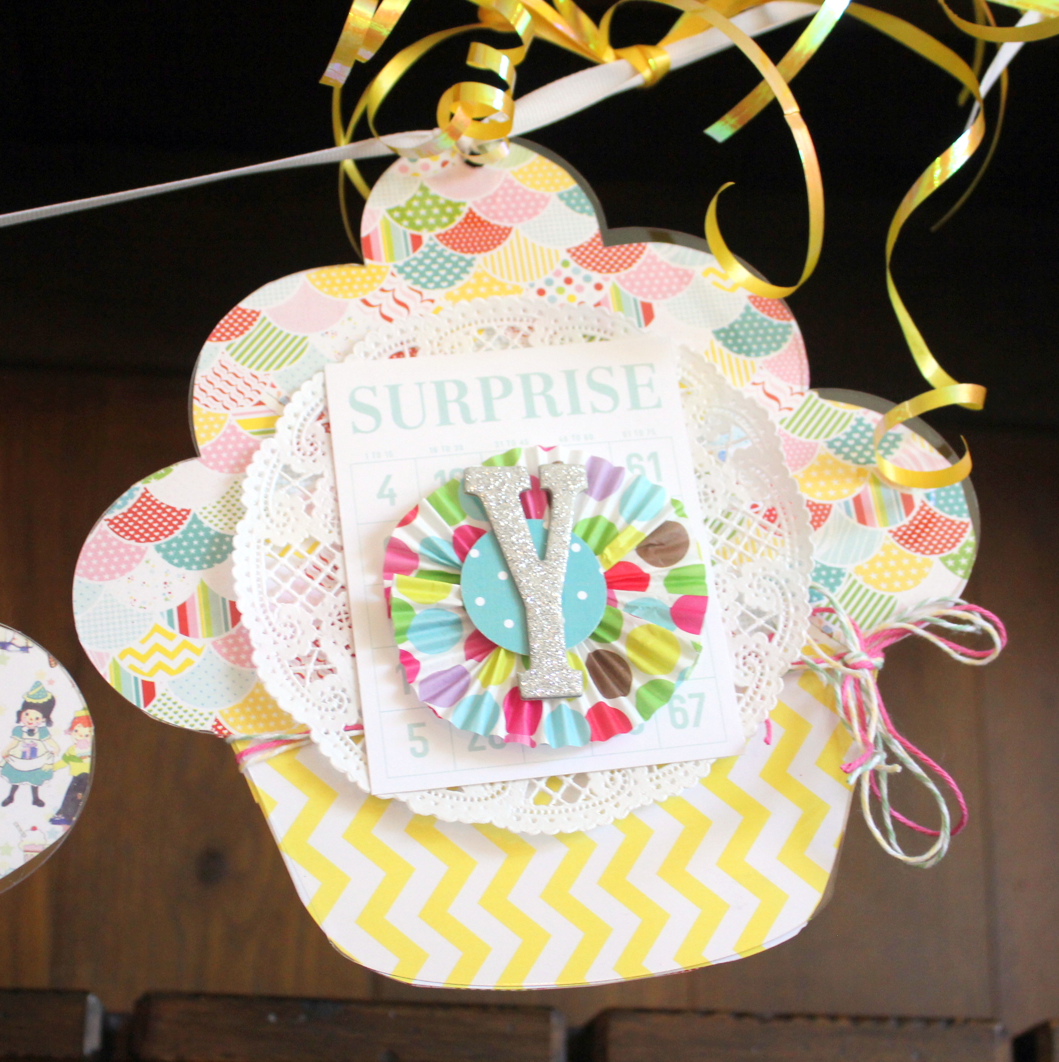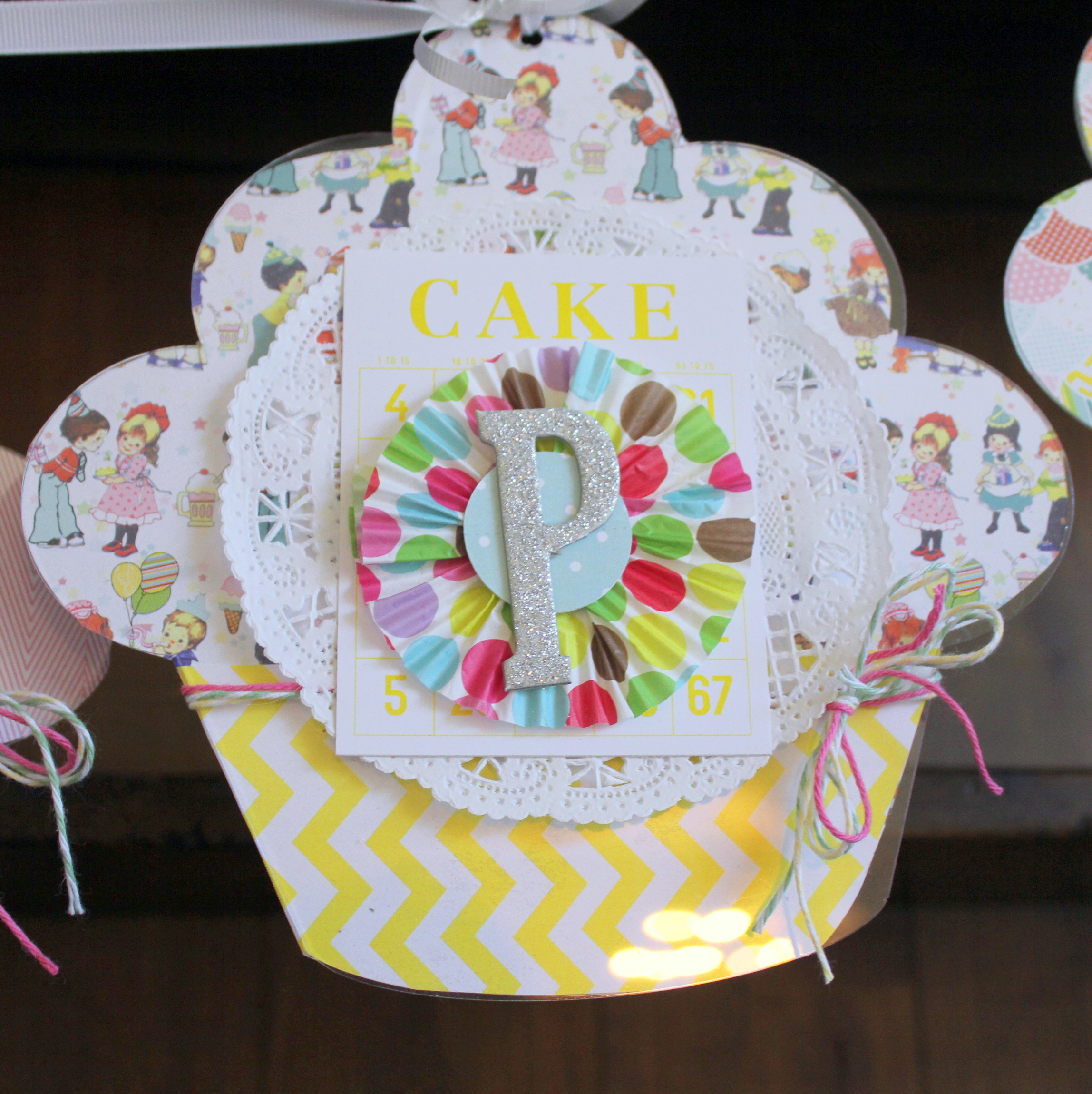 I used Pretty Little Studio 8 x 8 Birthday Cake papers for the background of the shapes. The 8 x 8 papers are the perfect size for these shapes! I simply traced the shape on the backside of the paper and fussy cut them out. I chose to add an additional layer to the bottom so the cupcakes look like they are in a wrapper 🙂