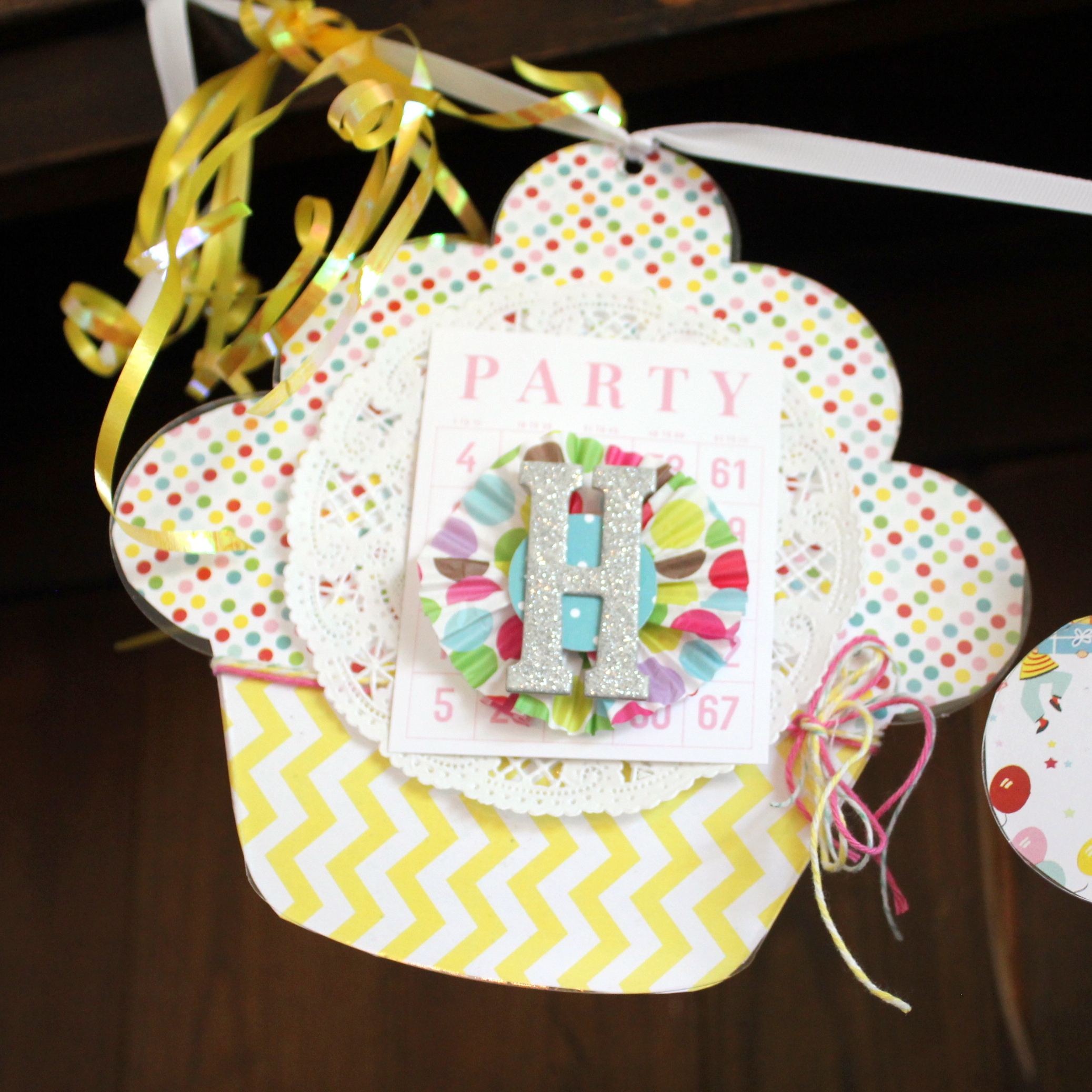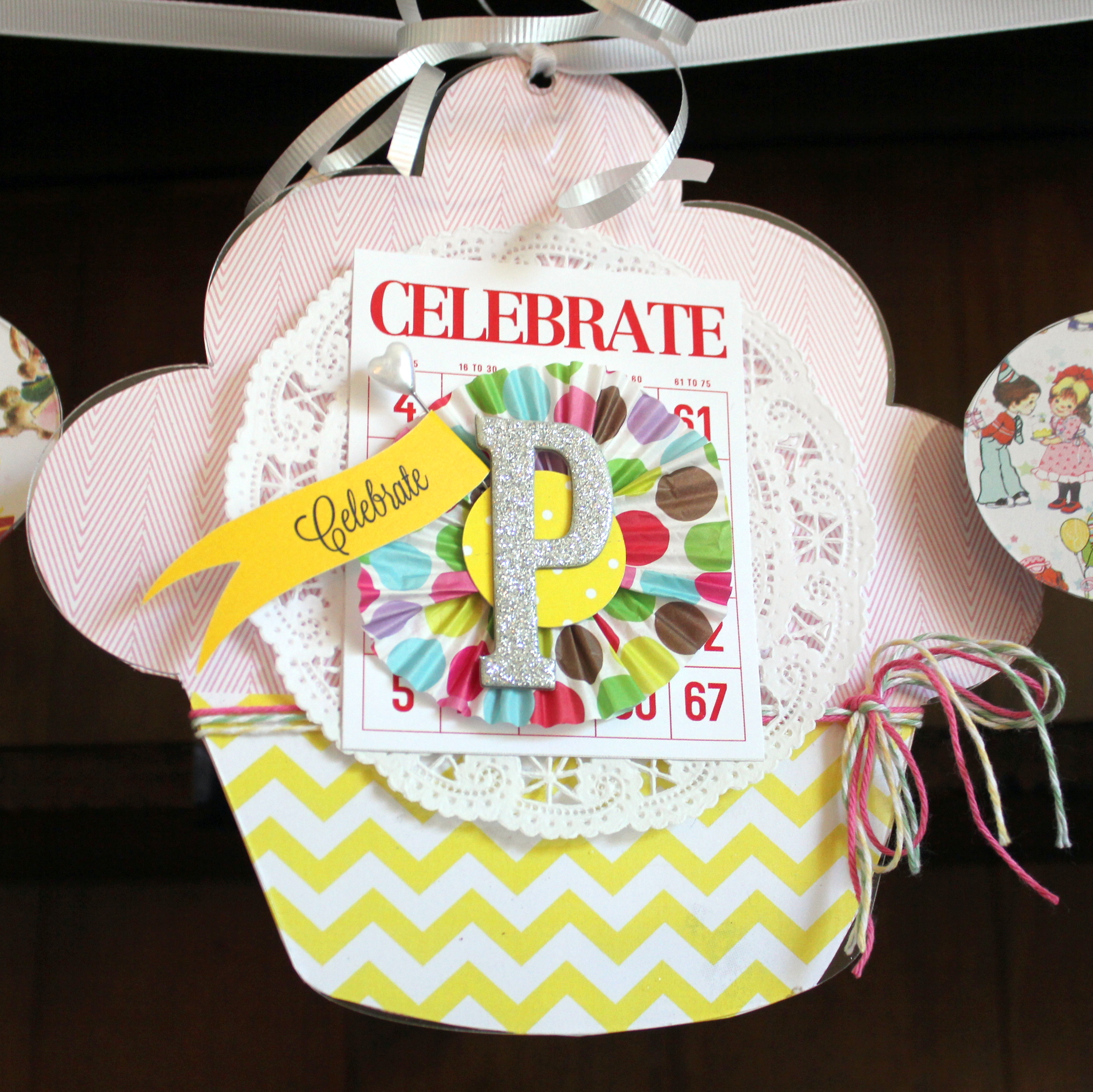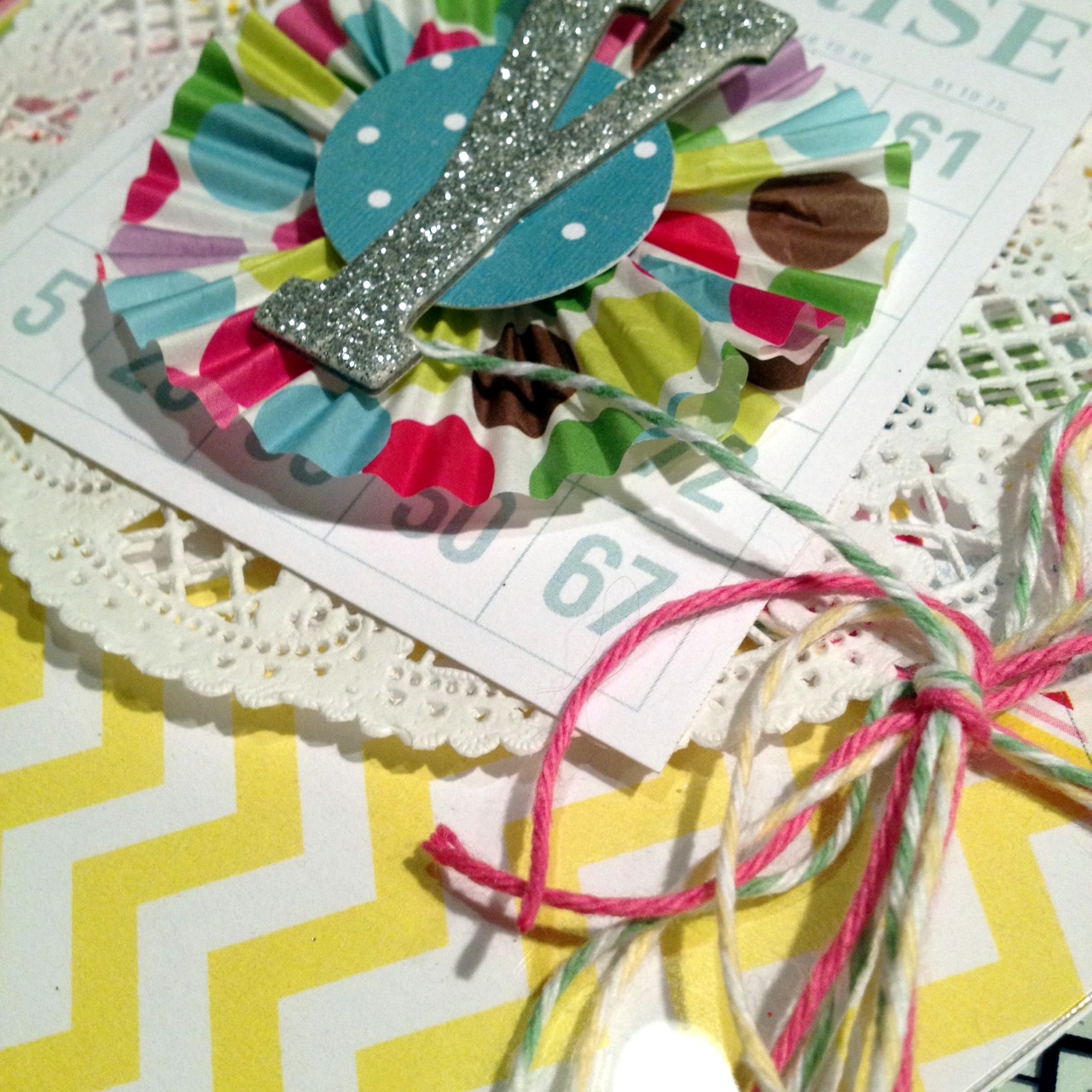 I layerd the wrapper on a doily, a Pretty Little Studio Bingo Card, a Circle and the Glittered chipboard letter. Twine ties each off and they look good enough to eat!