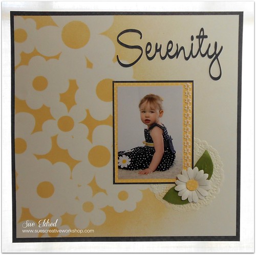 When I first got the 12" flower stencil I knew I wanted to experiment with white backgrounds. (something I'm not too comfortable with) My "Serenity" layout is made using the flower stencil on white card stock and misted with October Afternoon's Lemon Drop Sprinklers. I love how the stencil makes a soft, dramatic statement on the page. I wanted to keep the layout simple and added simple elements such as the daisy made with a punch from Marvy Uchida.