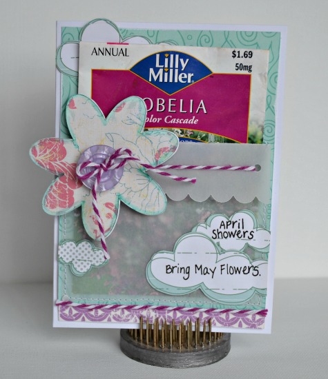 Following the theme, I created this pocket card and added a packet of flower seeds. This is a simple and easy "thank you" or "just because" gift. I used some vellum to create the pocket and stitched it in place.