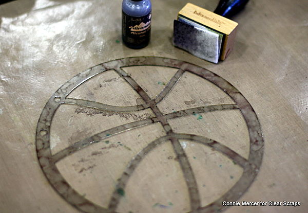 Then I took Alcohol Ink by Ranger and applied it to the front cover of the mini album, the actual basketball acrylic cut out. I used the slate color, so the cover would still show through the acrylic.