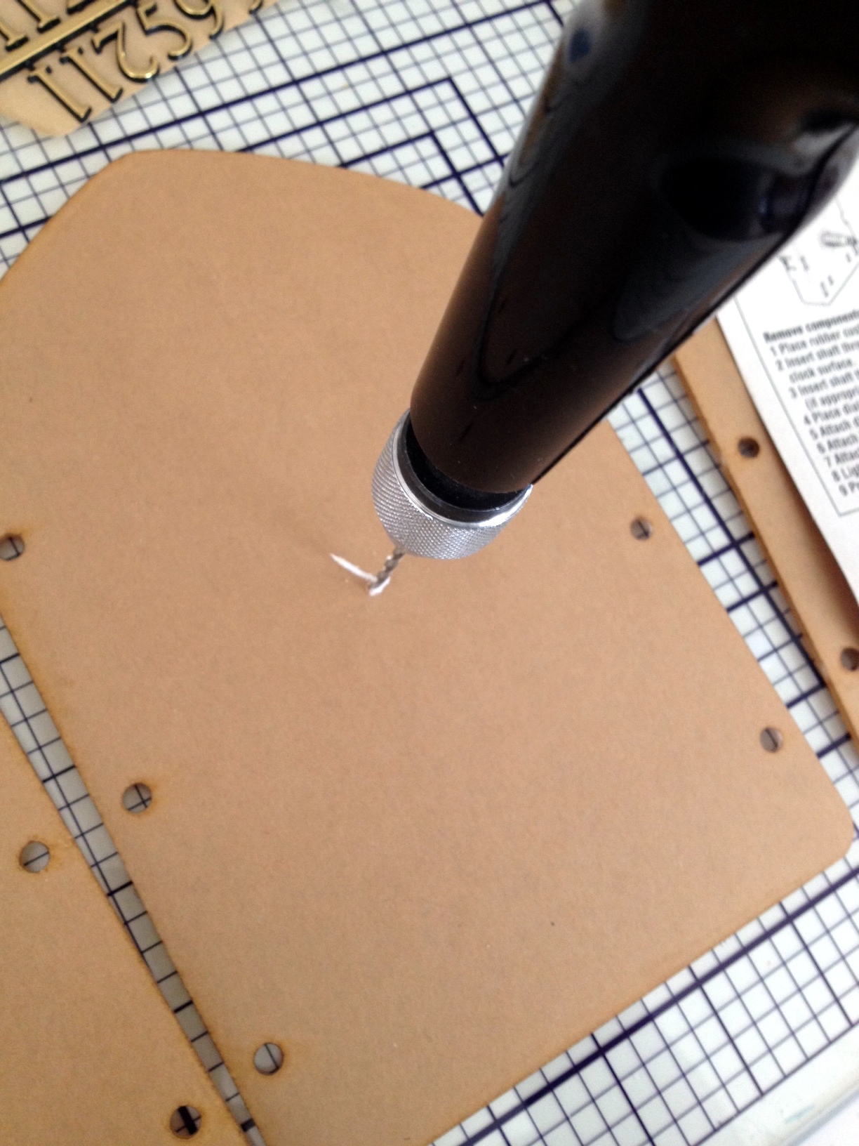 This is really easy to create using a craft store clock kit, a Fiskars hand drill and our Tri Fold Frame. Leaving the protective film on, I progressively drilled a hole where I wanted the mechanism to be. I used three sizes of drill bits..working slowly so that I didn't crack the acrylic.