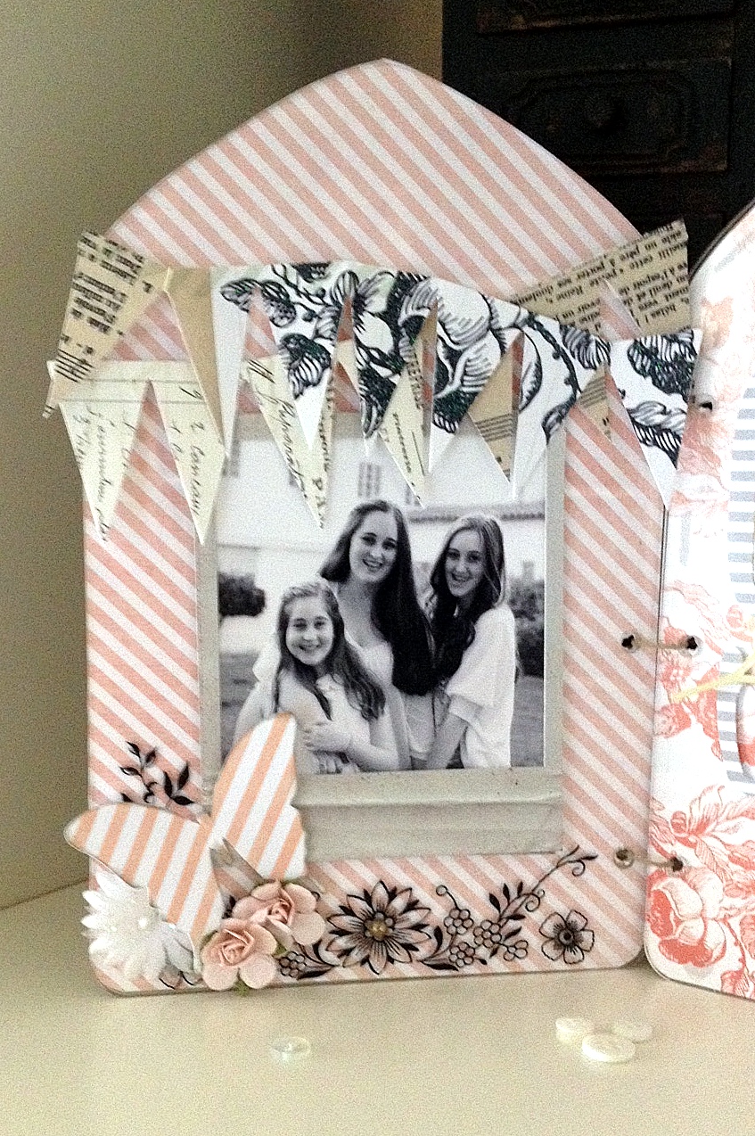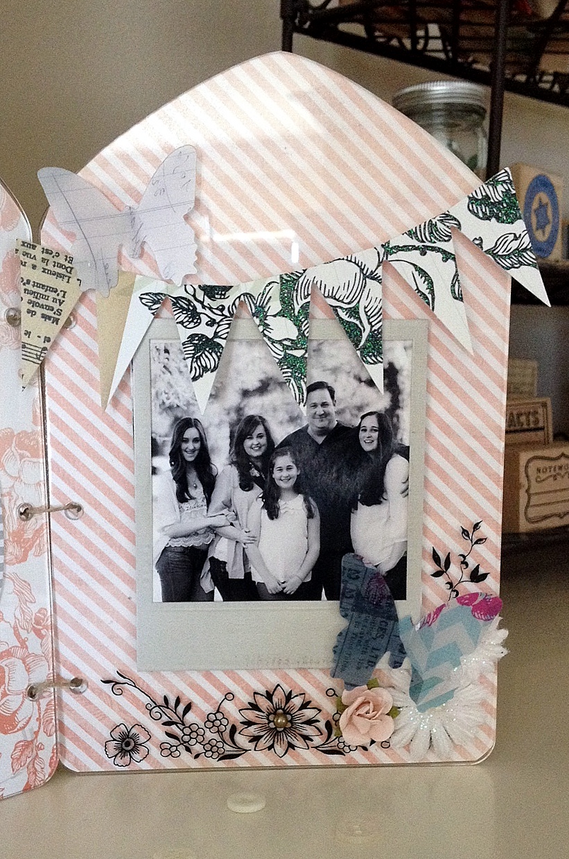Then I embellished each panel until I was happy with the look. I used Heidi Swapp papers, banners and empherma pack as well as her Insta frames and butterflies. I finished off the clock with some Jenni Bowlin rub ons (I love how they look like they float when they are on the front of the acrylic and paper is behind!) and Prima flowers. I tucked the photos into the frames and I like that I can update the clock with new photos very easily.