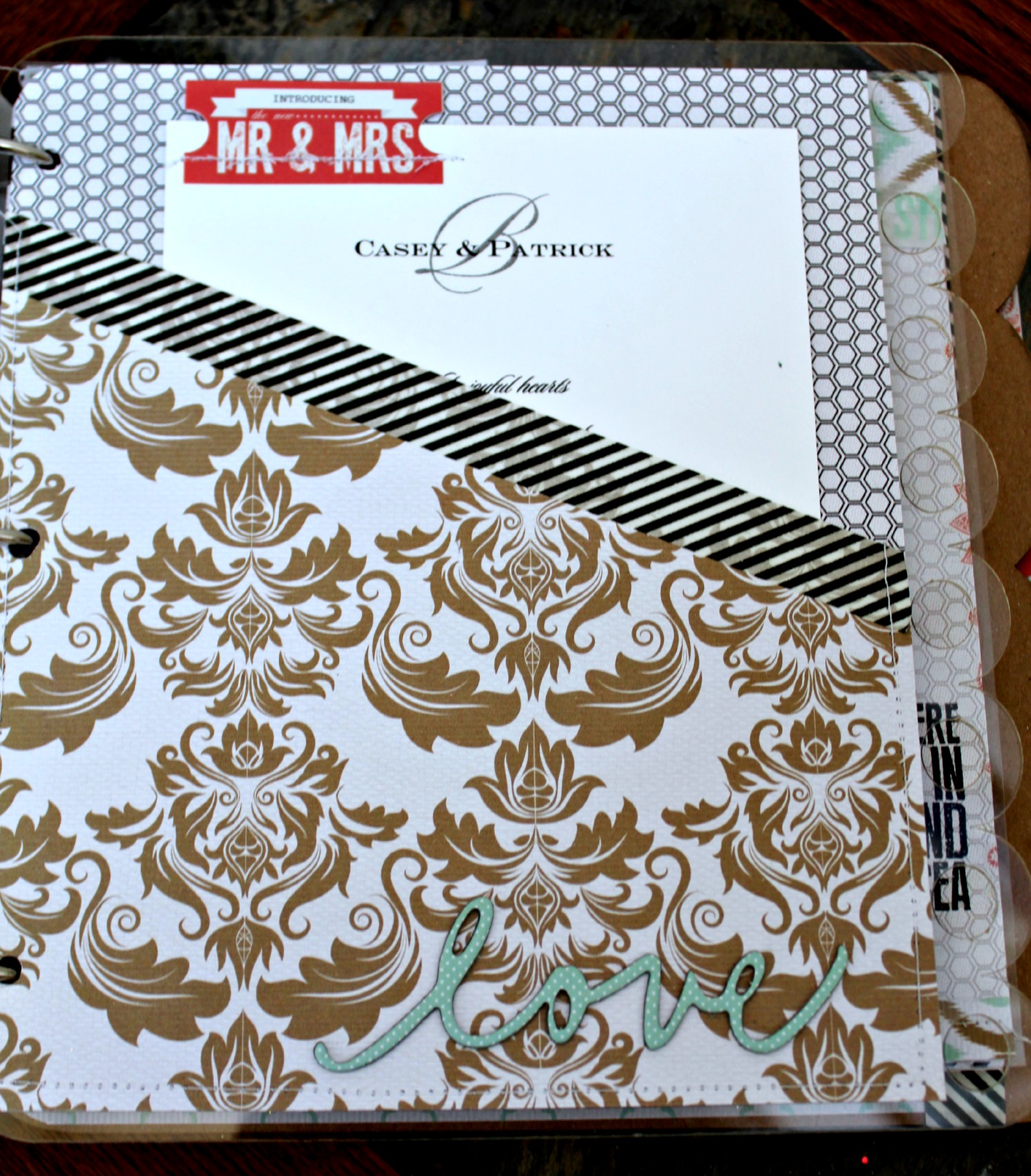 Additional products used: pattterned paper, stamps, washi tape,photo overlays, enamel dots, gems, chipboard, decorative brads, vellum envelope and bag, stickers: Teresa Collins Designs; fabric flower: Pink Paislee; ink: Ranger; binder jewels: 7gypsies; bakers twine: My Mind's Eye; wood veneer hearts: Studio Calico; misc: thread, sewing machine, book rings, doily, seam binding.