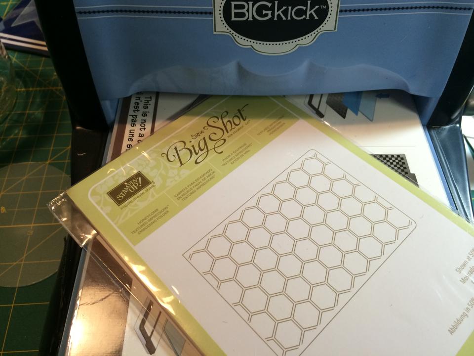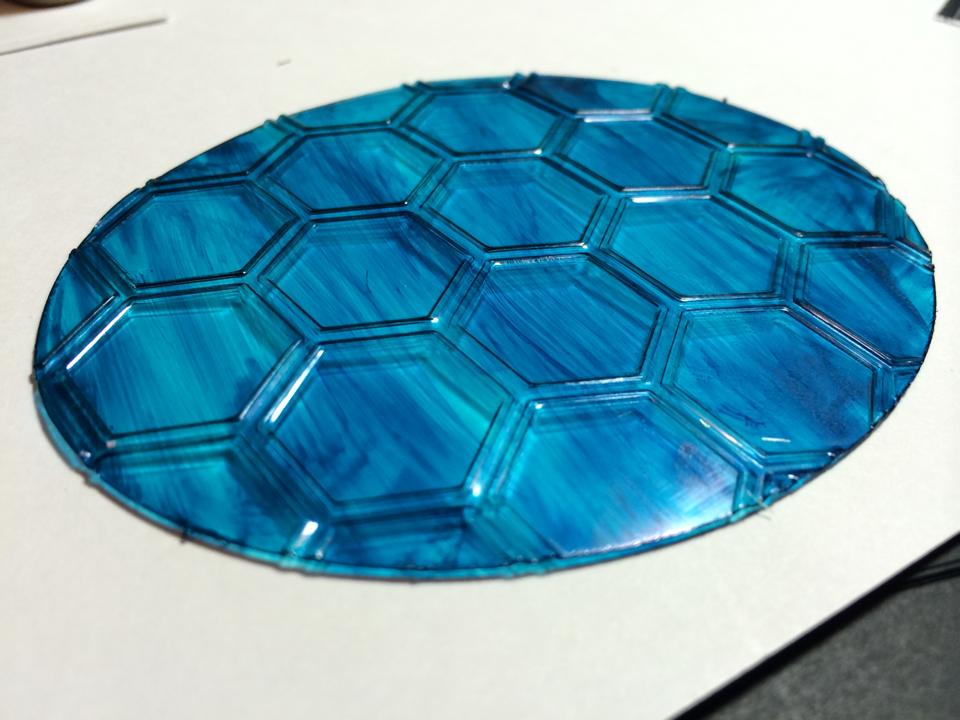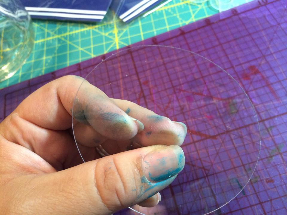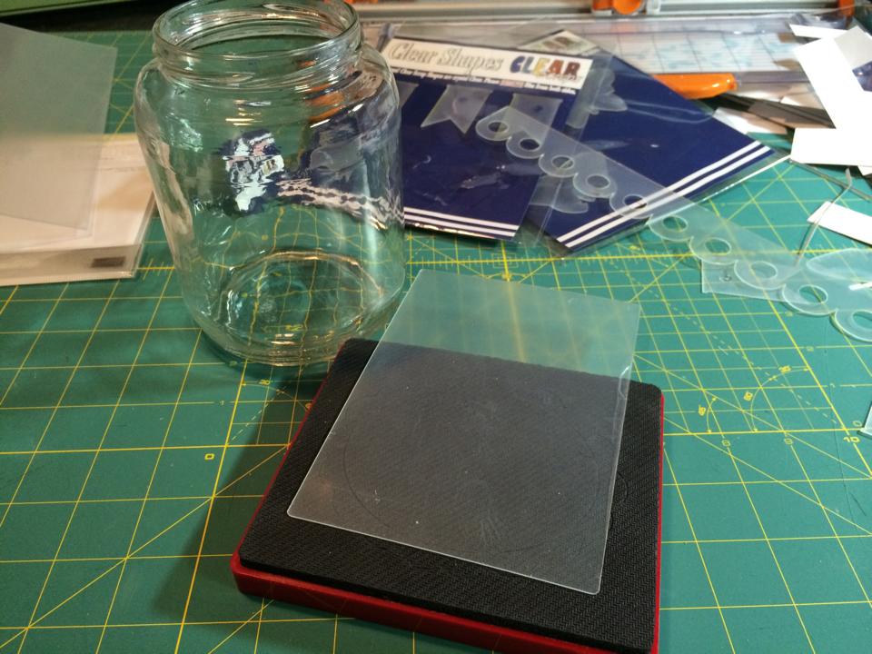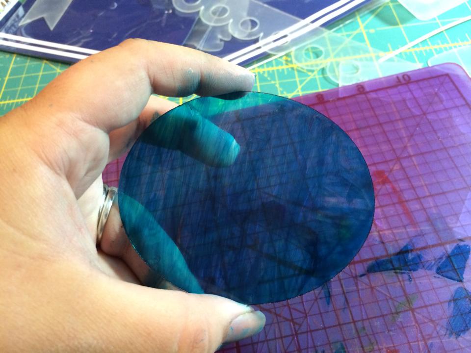 So the first thing you do after its super wash down, is remove the jar's label. I then I used my good old Scalloped Oval Frame die, I die cut JUST the oval part out of the acrylic sheet,  to create the main piece to this project. I then inked the oval with stream alcohol ink, and embossed it with my Stampin' Up Honey Comb folder.
