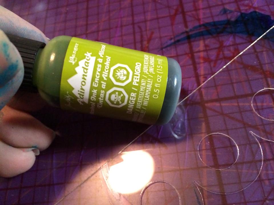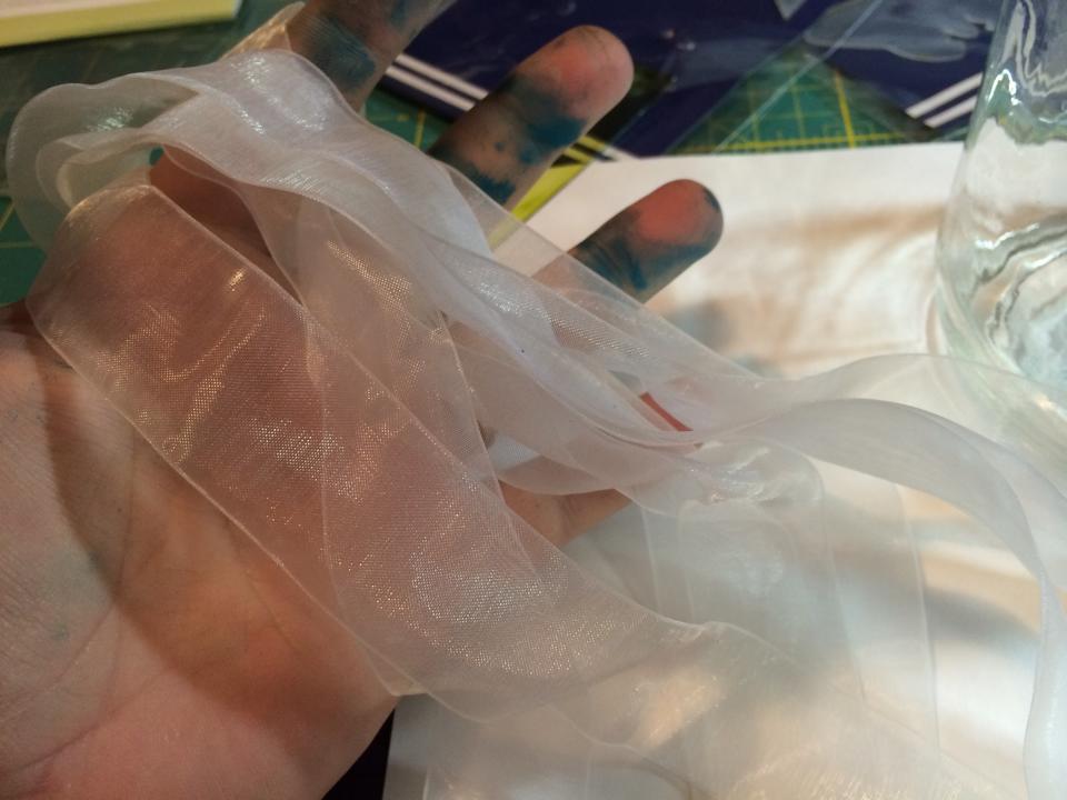 While I let the ink dry completely, I used the scalloped border, and inked it with lettuce alcohol ink. Then I fed my sheer white ribbon through the holes while wrapping it around the jar.