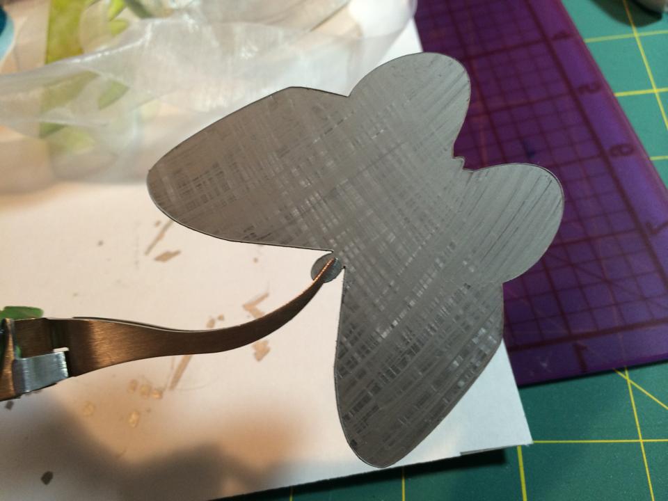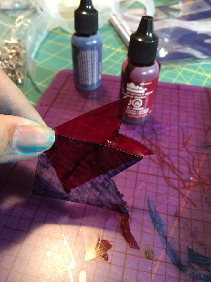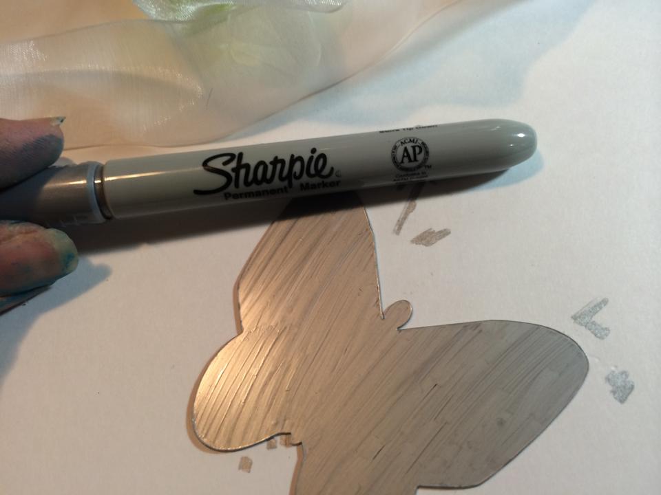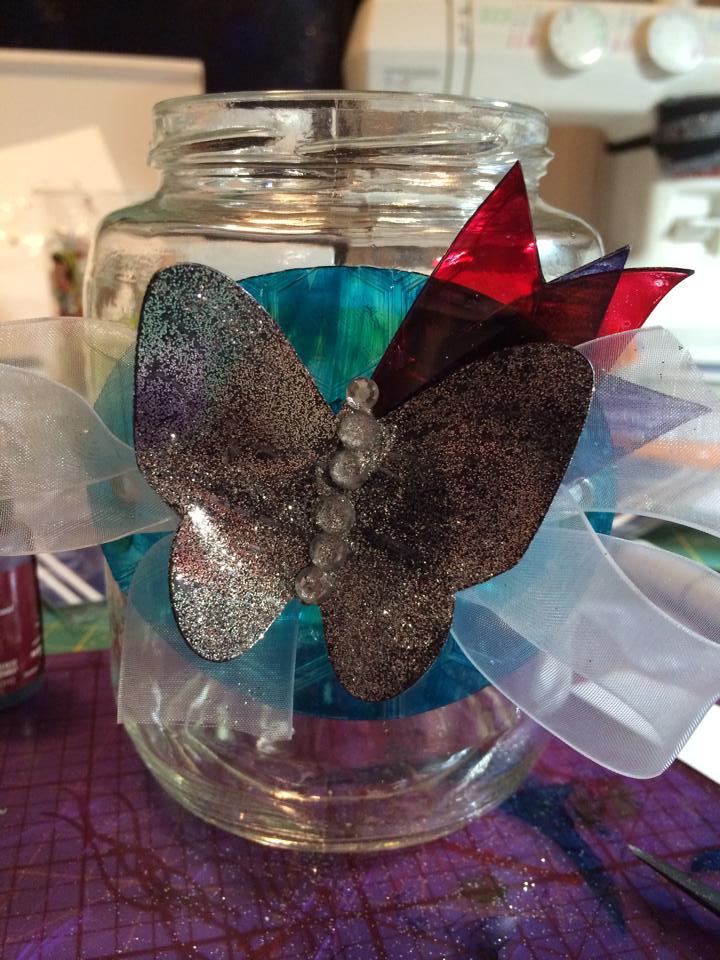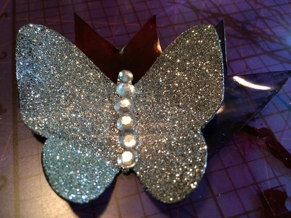 Now, while both of these items with the inks are resting (to not push the stickiness of the ink) I played with on of the pretty butterflies. I ended up covering it with sivler sharpie, and silver glitter. Then I placed little silver gems up the center!