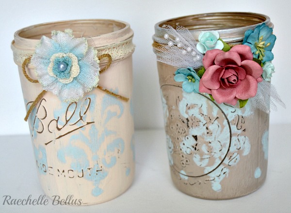 To create my jars, I added a few coats of paint to each jar, allowing ample time to dry before each coat. I then used the 12" Damask stencil to create my design.