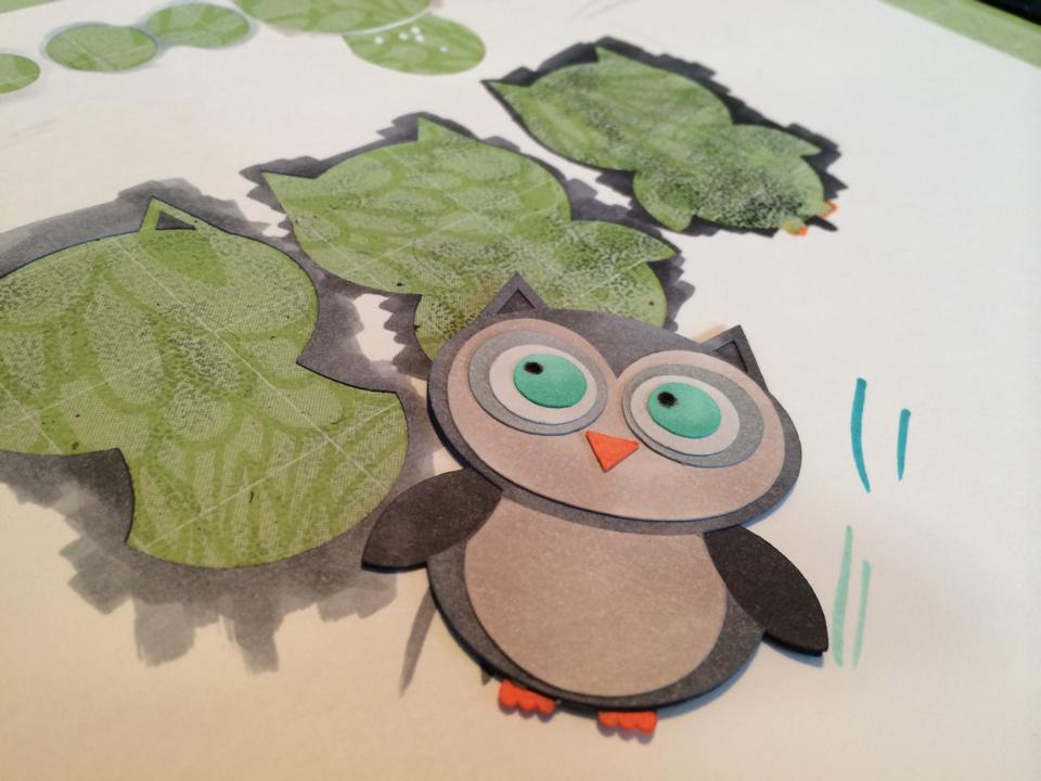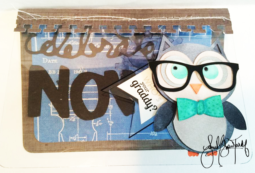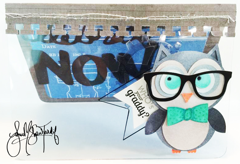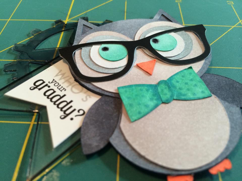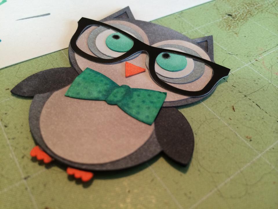 I then cut out a little owl from my Cricut Explore, colored it with my Spectrum Noir markers, then added a few little touches – glasses, and a bow tie.