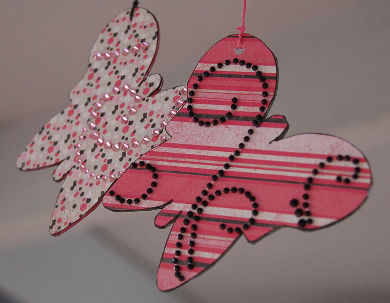 I covered each butterfly with patterned paper and used my crop-a-dile to repunch the holes in the butterfly wings.
