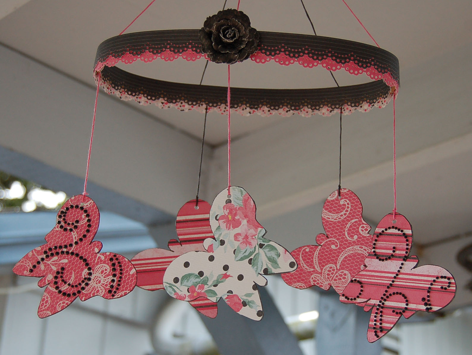 To hang the butterflies, I used embroidery floss and tied them through the holes on the butterfly wings and then tied them to the inside ring of a hoop ring.  This one happend to be an oblong shape.