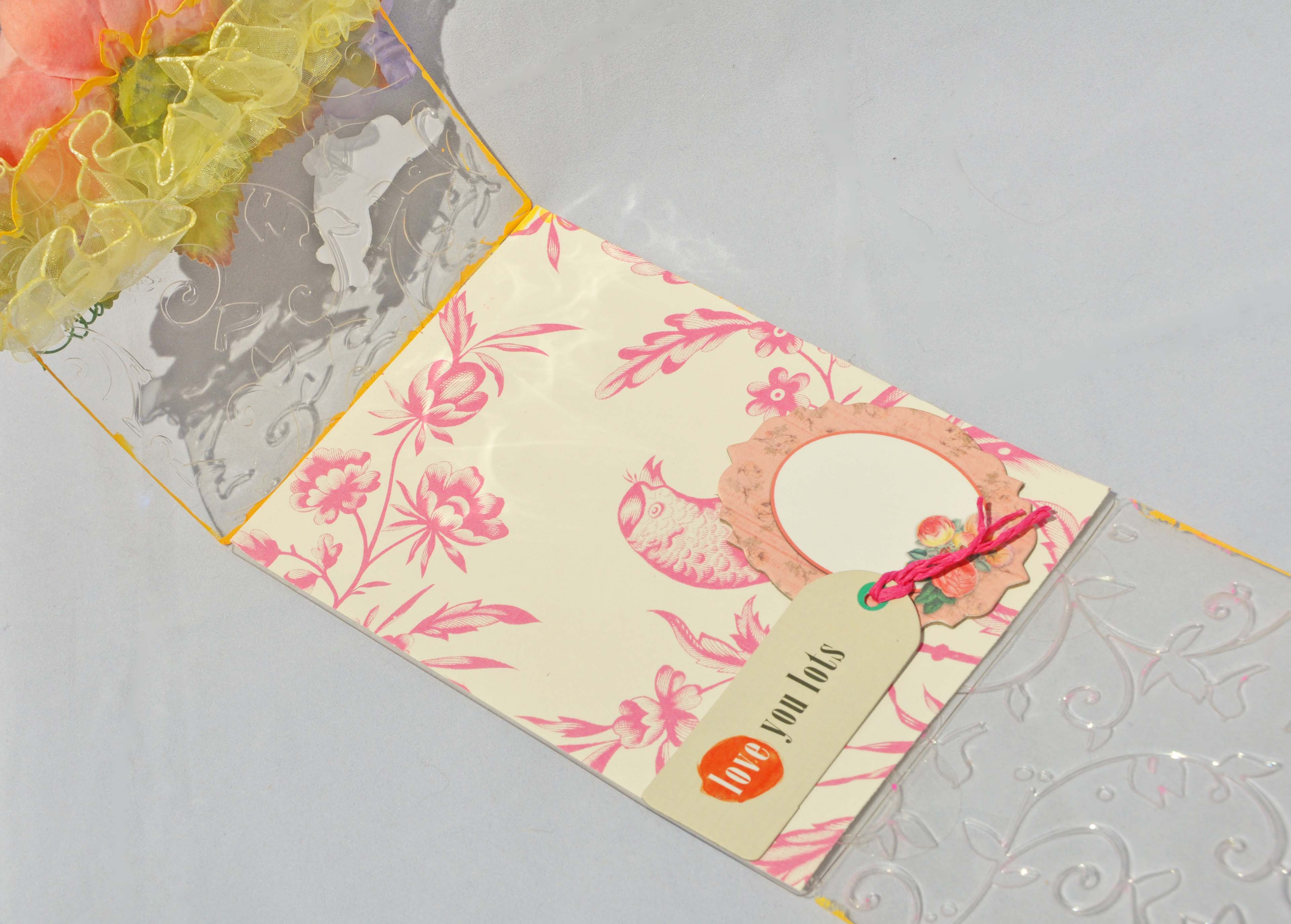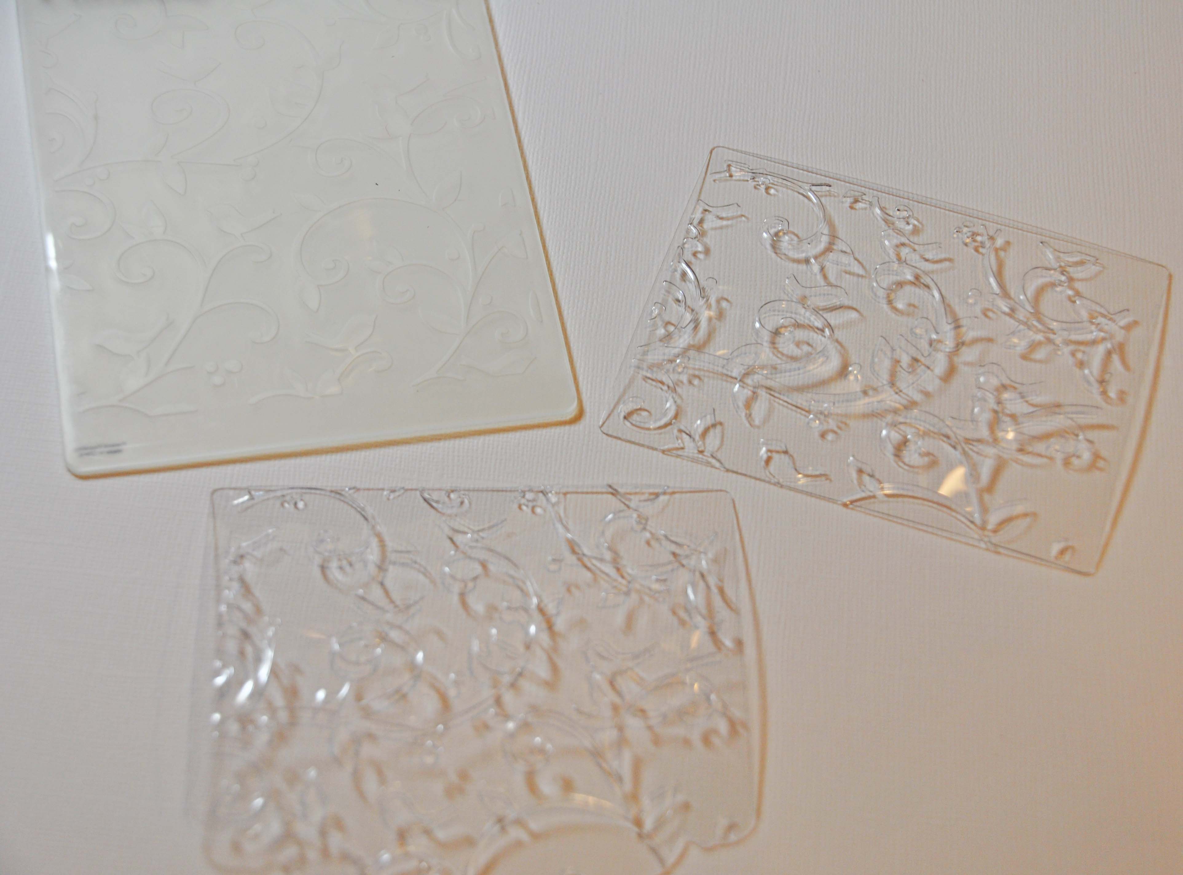To create this card I began by embossing the top pieces of the card with a Cuttlebug embossing folder and my Sizzix machine. I love how easy it is to add that extra bit of dimension to Clear Scrap acrylic with embossing.