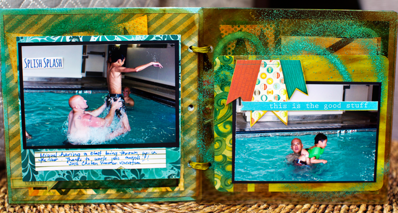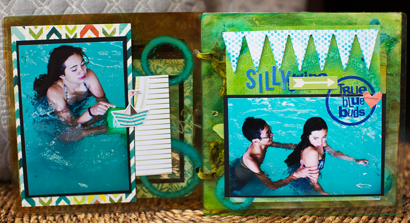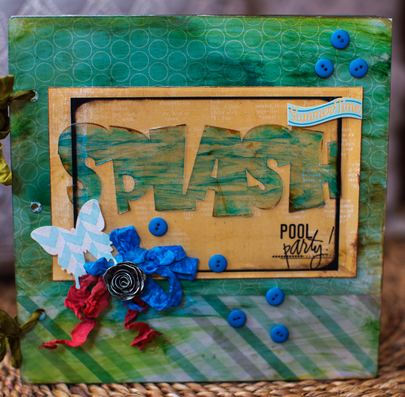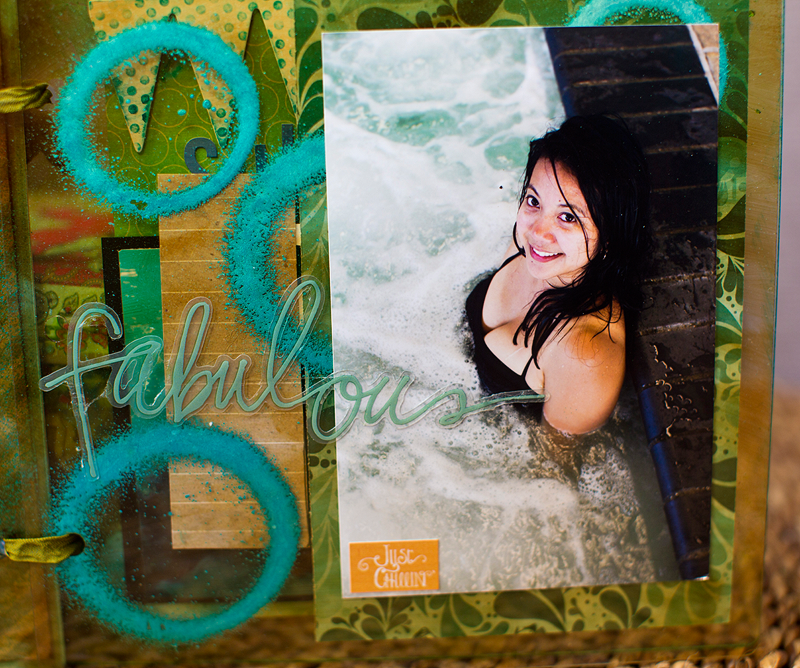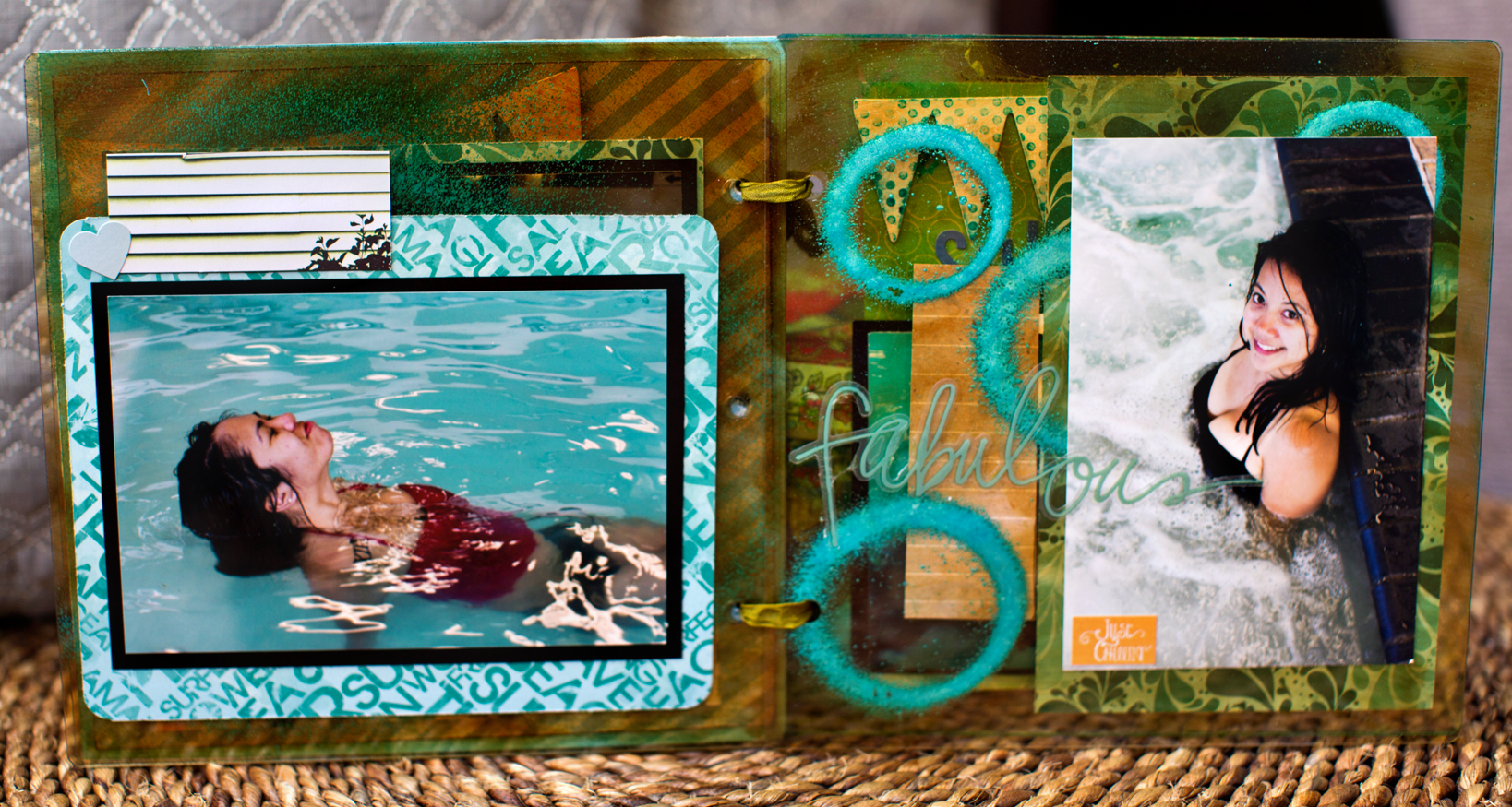 Supplies Used: Clear Scraps Acrylic 8×8 Regular Album, Clear Scraps Small Splash Expression, Stazon Ink Pad, Heidi Swapp Papers and Color Shine Spray, Beacon All Purpose Adhesive Glue.