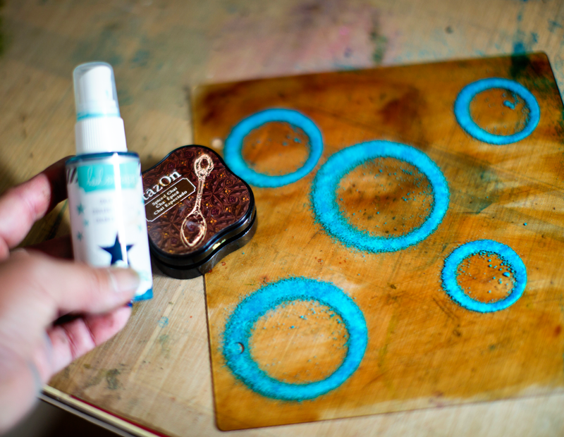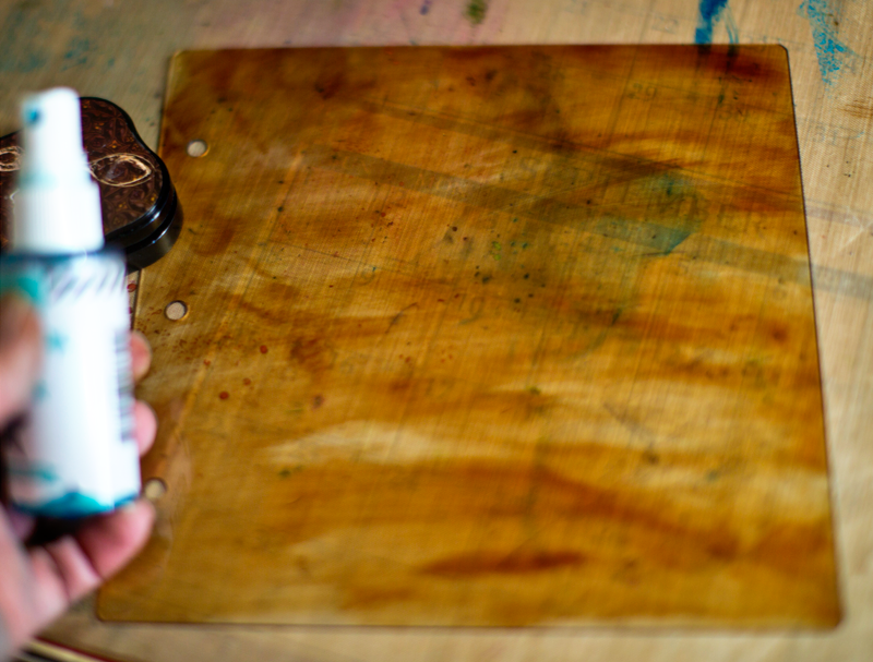 First step: prepare my backgrounds/acrylic pages by adding color using the stazon ink, by simply rubbing the inkpad directly onto the acrylic.