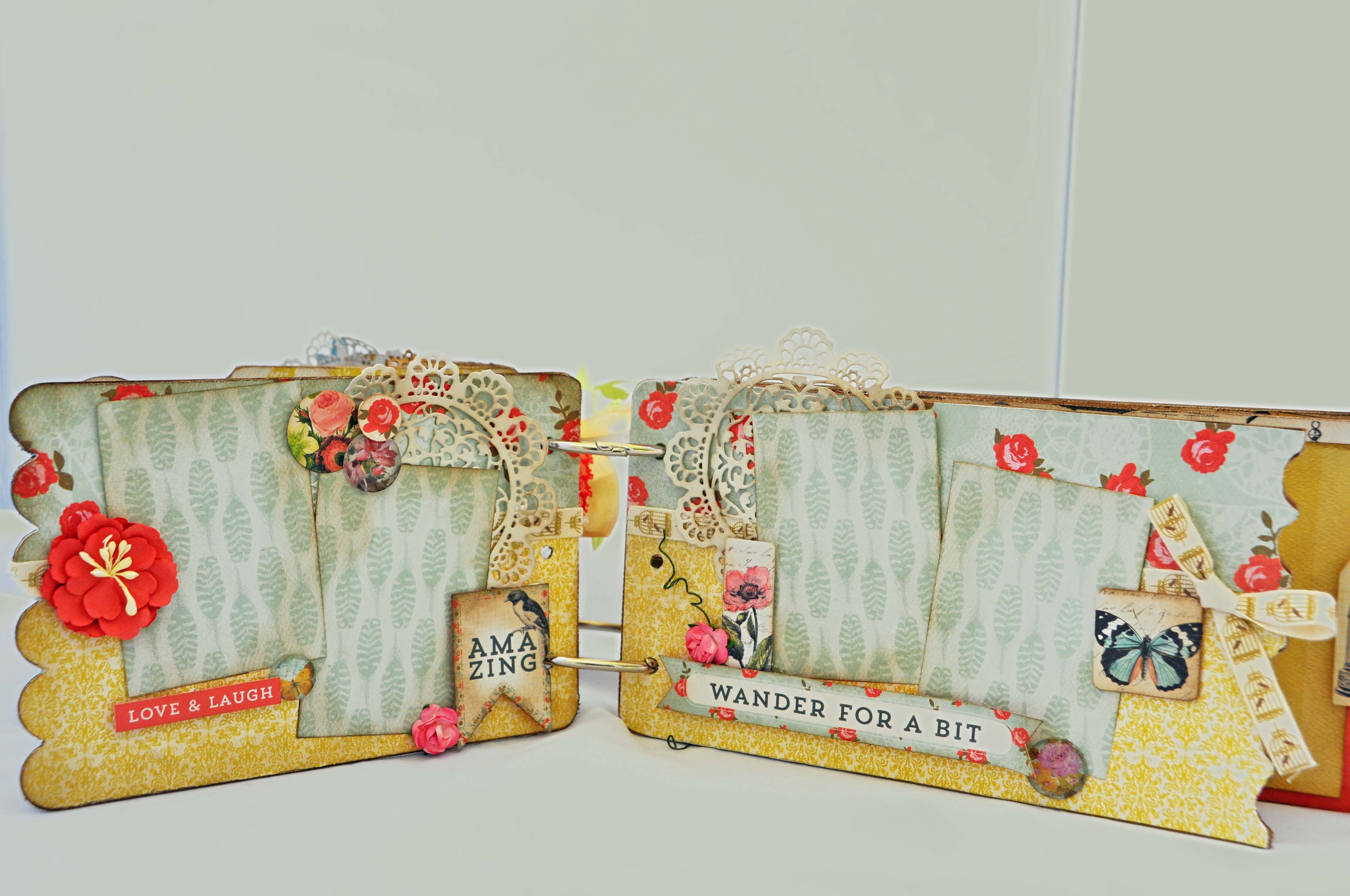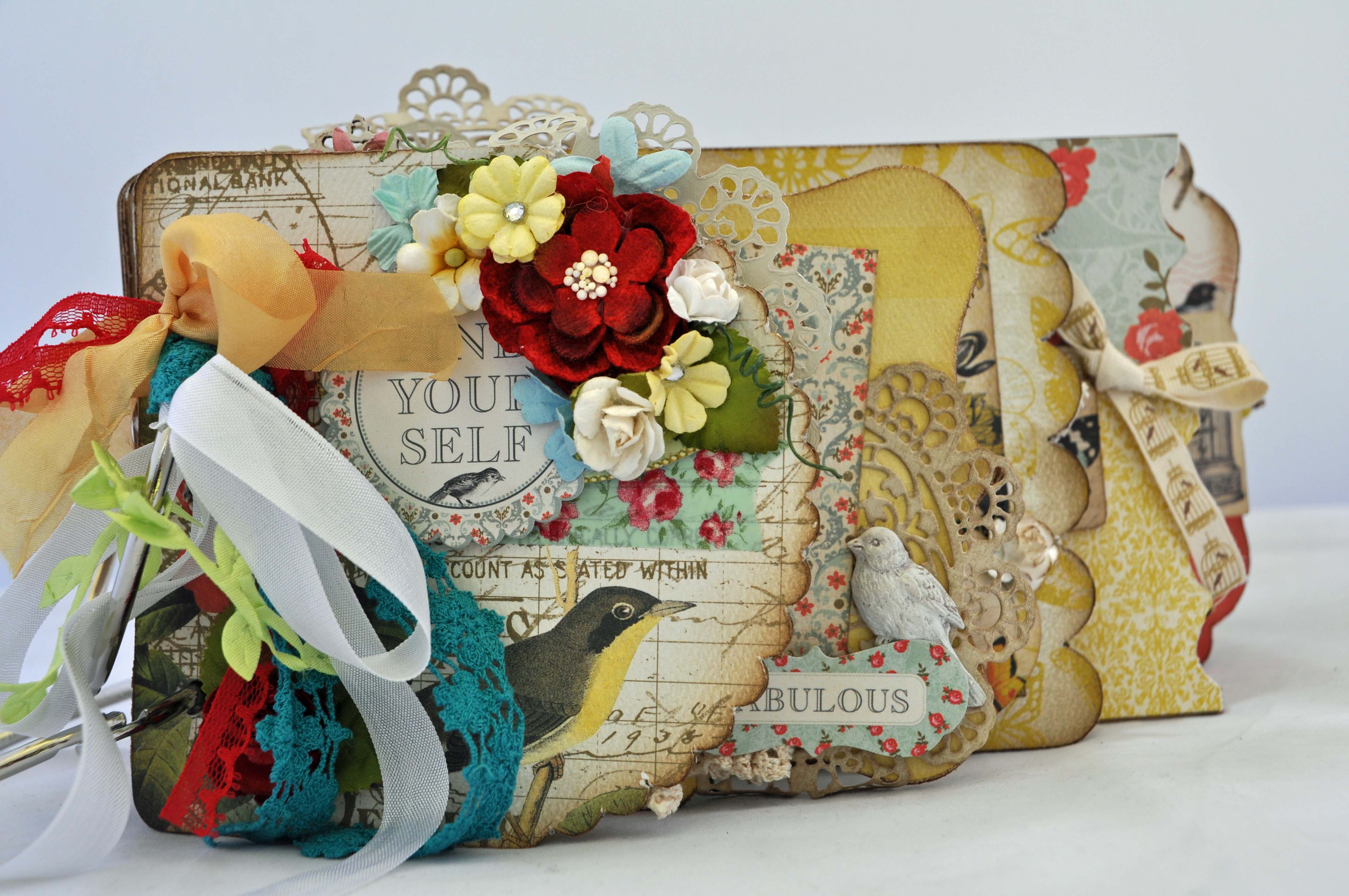 I filled my mini with papers from Authentique and lots of beautiful trims, flowers, and doilies. And of course lots of inking to age everything just a bit.