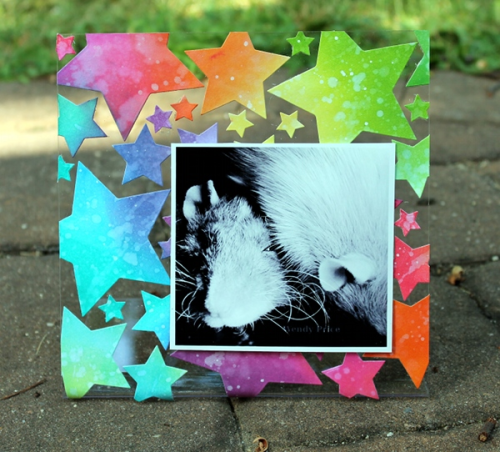 - Ink white cardstock with a rainbow of colors. Splatter with water to distress. Allow to dry.