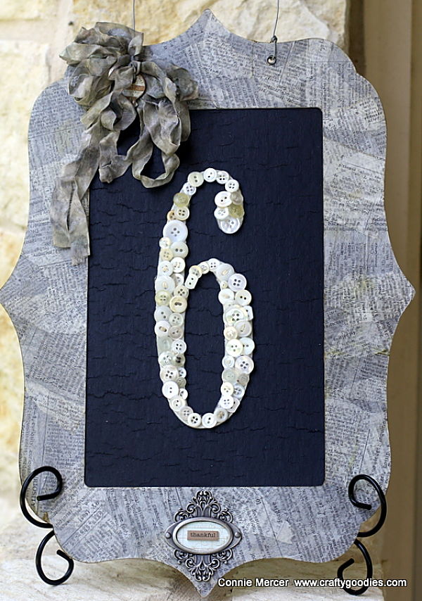 3. Cover a chipboard number or shape with buttons. I used 3-in-1 by Beacon to adhere the buttons to the "6" number ( chipboard).