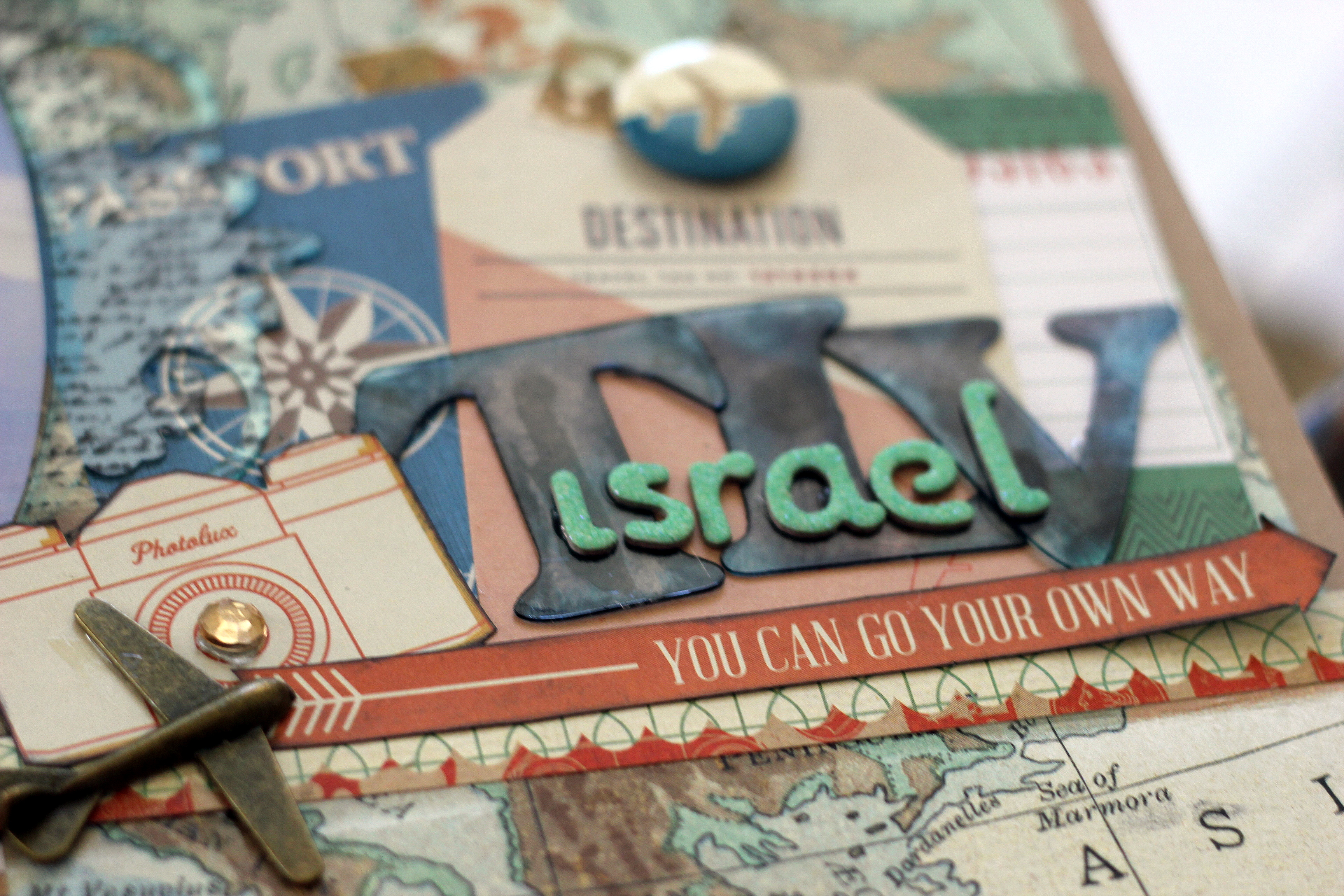 For this layout, I created a frame using the Medium Oval Fancy Frame, a script stamp with Jet Black Staz-On ink and a rub of the Blue Hawaii Staz-On ink. I love how well it matches the paper and photo! I also created some custom letters from our Acrylic Alphabet. Both Staz-on inks were used to create a mottled effect for the airport code TLV (Tel Aviv).
