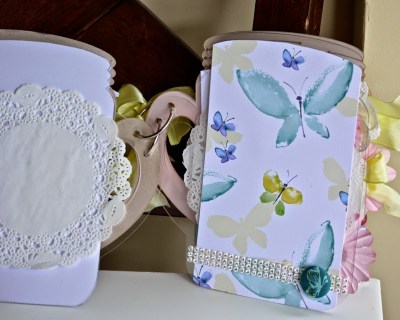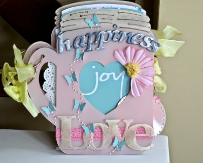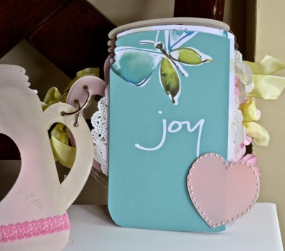 I spray painted the from and back page using a soft pink spray paint (Krylon) for the jar area and a brushed nickel for the lid area. Then I accented it using a bronze liquid pearl bottle.