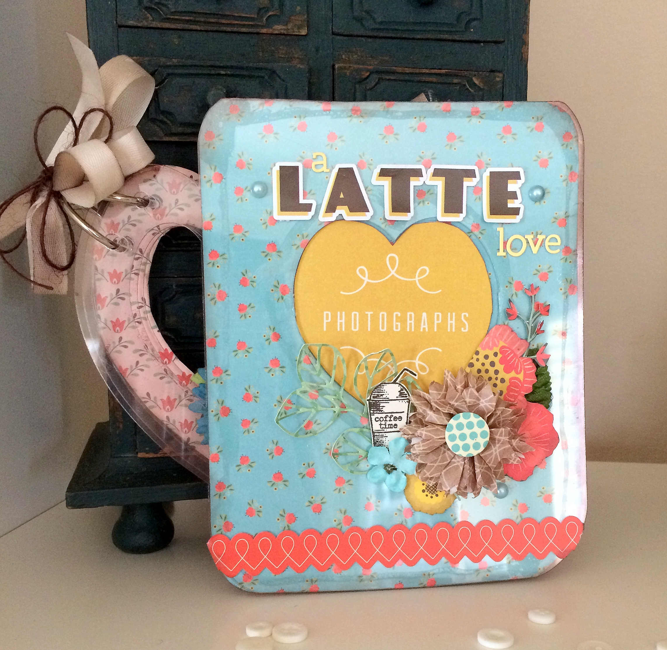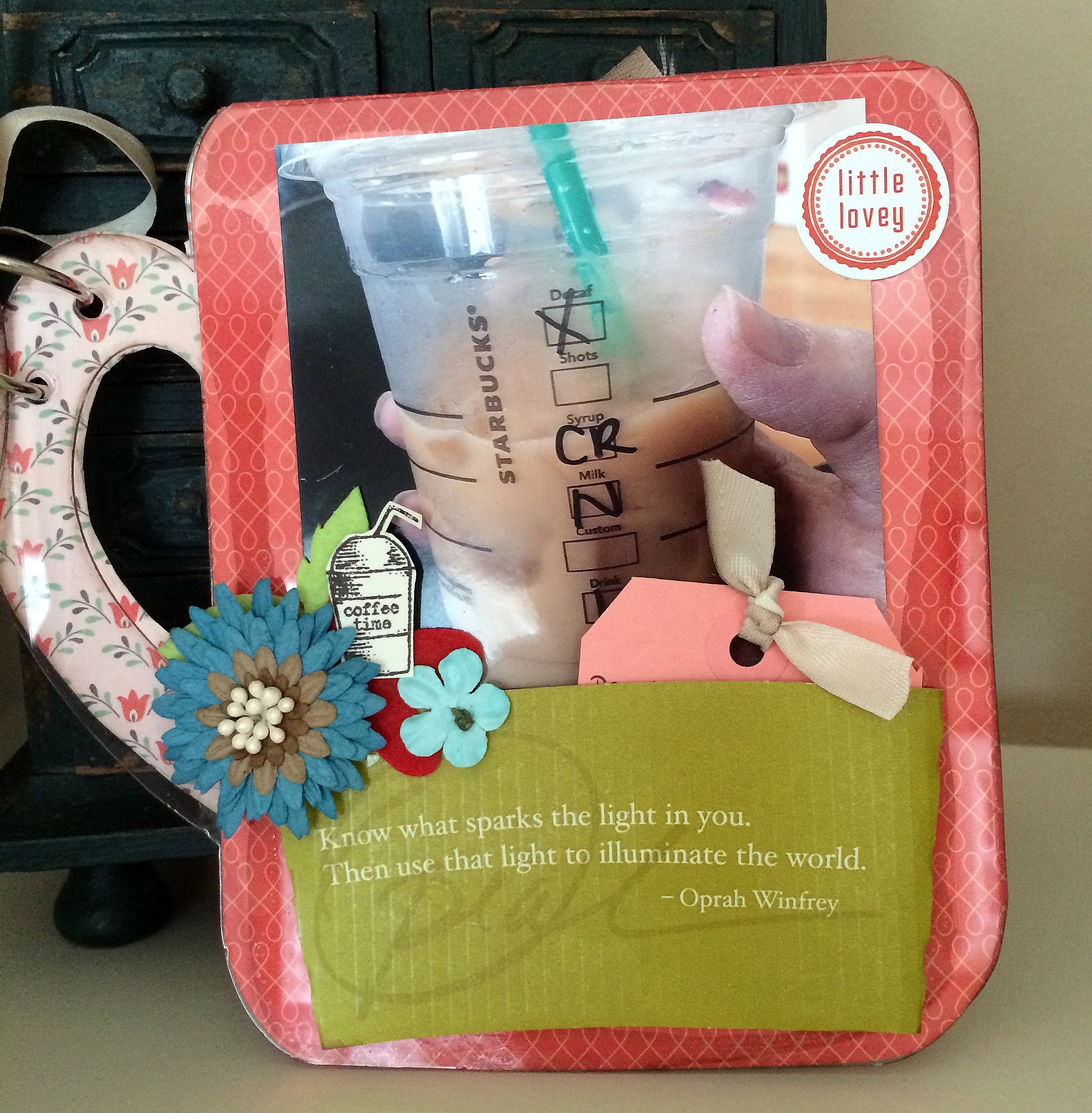 I just loved putting together this little mini to immortalize my love of coffee and some of my favorite snaps of it. For starters, I did alter the album by using my Tim Holtz Tonic scissors to cut off the top of the album…it was the entire part that looked like the threads of the jar and what I was left with looks just like a coffee mug, I was so happy! Here's a look at my favorite page where I created a little pocket using a Starbucks coffee sleeve with a wonderful Oprah quote on it. My journaling is on the tag tucked into the pocket.