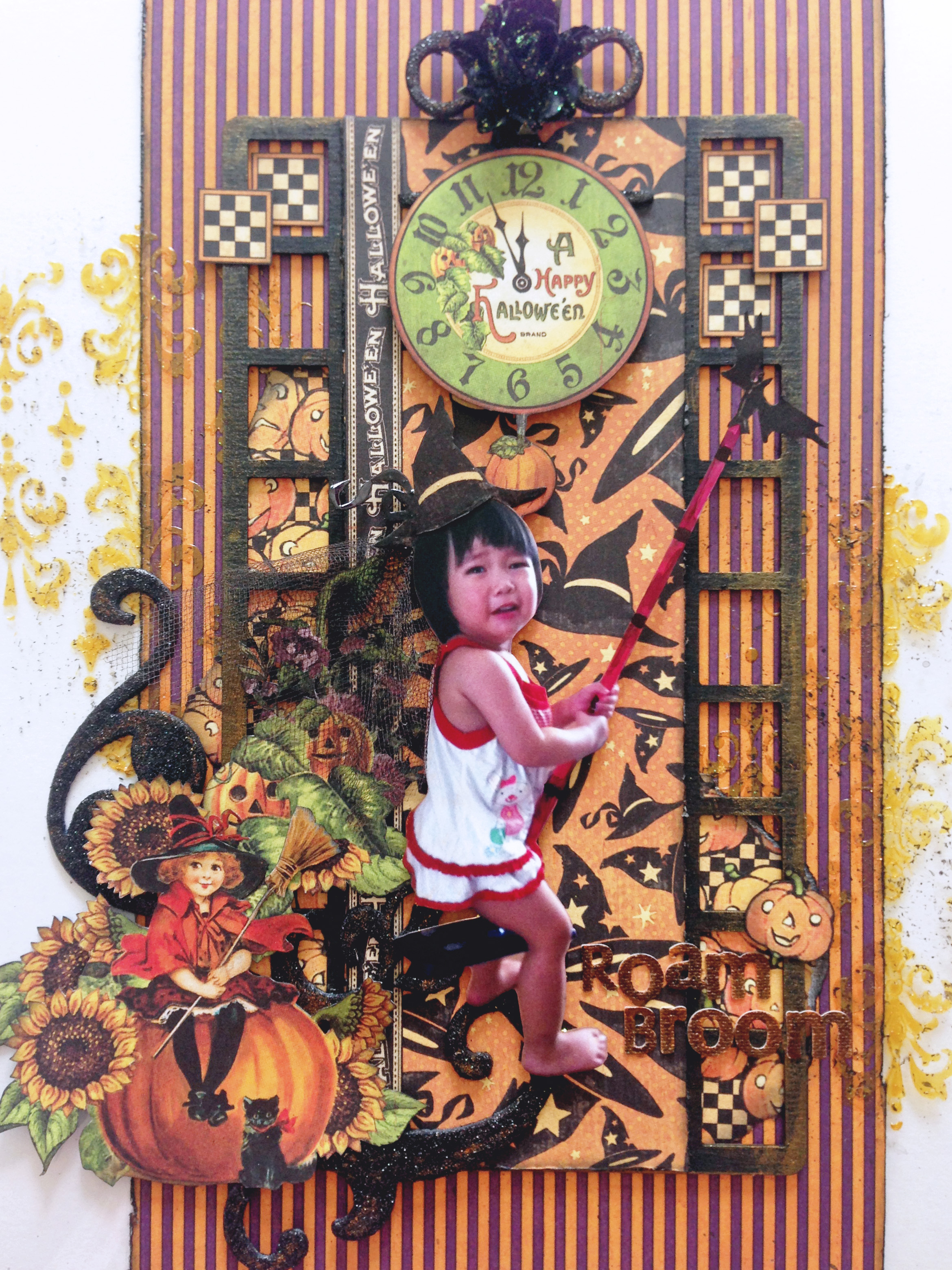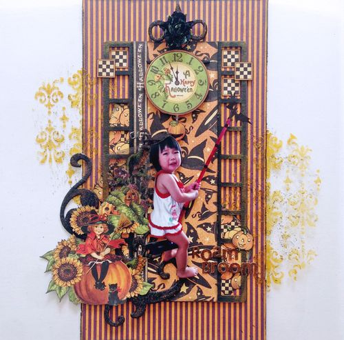 Katie here sharing one cute Halloween layout featuring my niece when she was around 2 years old… She was actually trying to sweep the floor for us but she ended up getting the wrong broom and got herself stuck underneath her pants and couldn't get herself out… I found this pretty amusing and snapped a pic of her funny yet desperate expression…