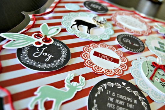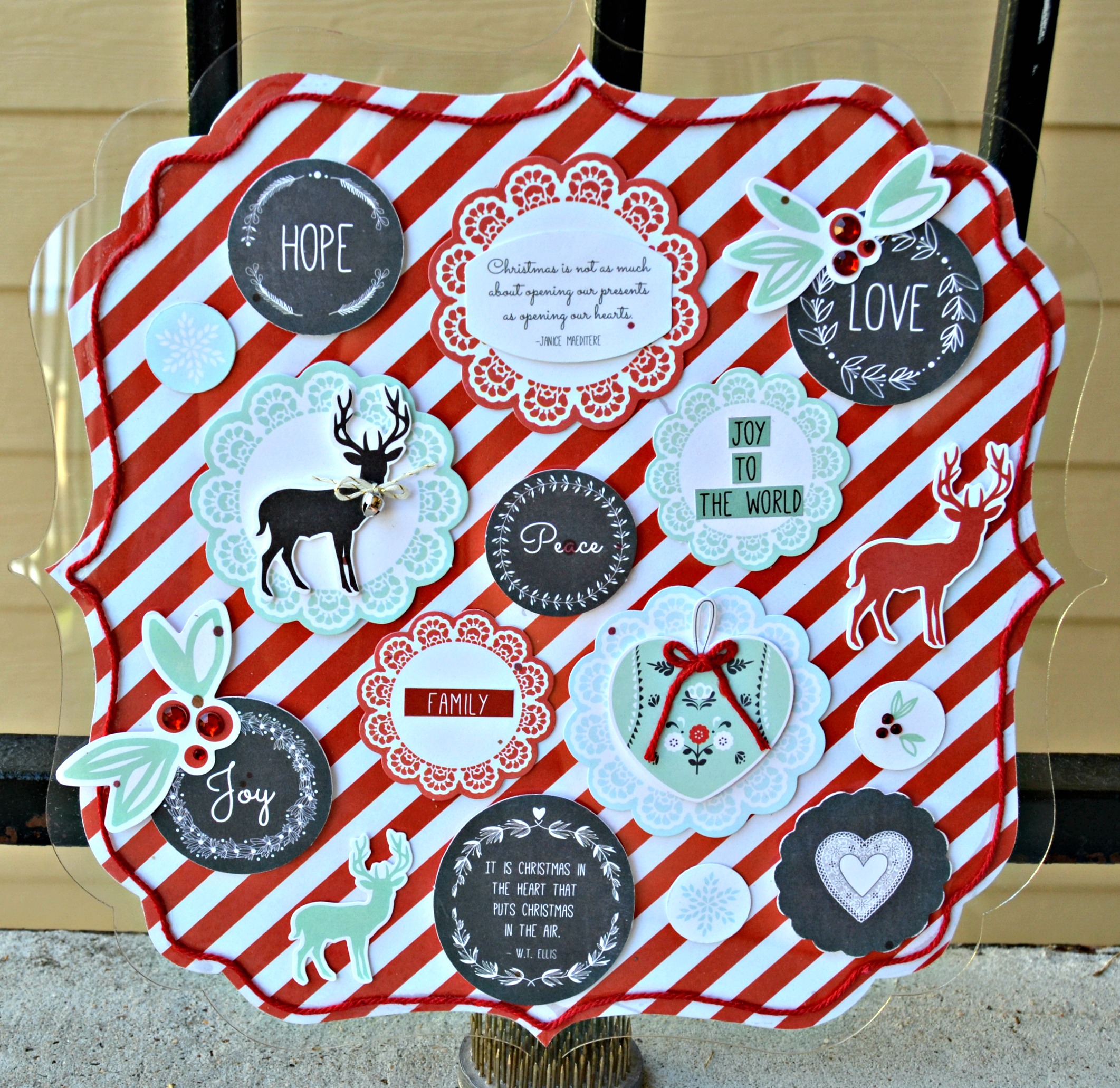 I used a Clear Scraps XL DECCO Acrylic Shape as the base for my project. These come as a pack with two great shapes! I trimmed the Kaisercraft North Pole patterned paper a bit smaller than the design and placed it on the backside. Next I added a red twine border around the edge on the front. I then added some Kaisercraft North Pole die cuts and finished them off with some rhinestones, a bell and some twine. Some are lying flat on the acrylic shape, and others are popped up with some foam stickers.
