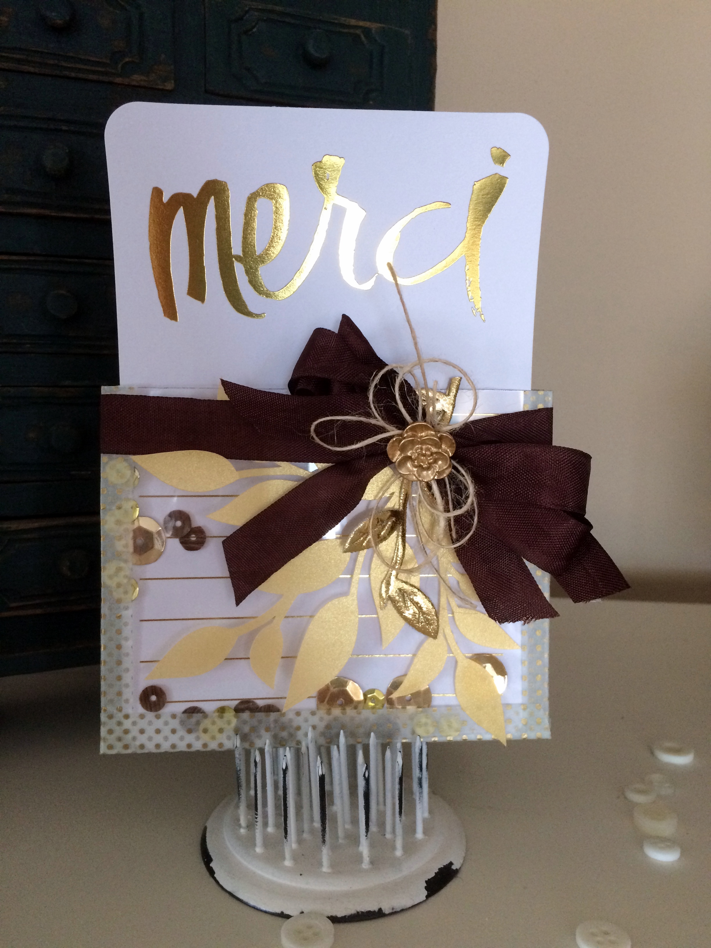 Hi there, Lisa here today to share a Thank You Card I created using our 12 x 12 Acrylic Sheet. I was creating another project using our Acrylic Sheets and I had a couple of scraps sitting on my table and I realized they'd make a great pocket, so I grabbed some washi tape and whipped up this cute little pocket that fits a 4 x 6 card perfectly. In this case, I used a pre-printed Heidi Swapp project life card that says "merci" in gold. I love how the message can be seen through the pocket, and I can even tuck in a gift card if I'd like. The sequins just made for a more festive card, don't you think?