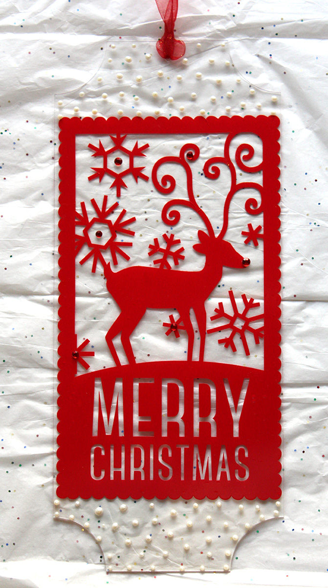I adhered my Christmas element to the front of the plaque. I then added a hole to the top and tied a ribbon through so it could be hung later. I randomly added some red bling and finished it off with little pearls using my Viva Pearl Pen.