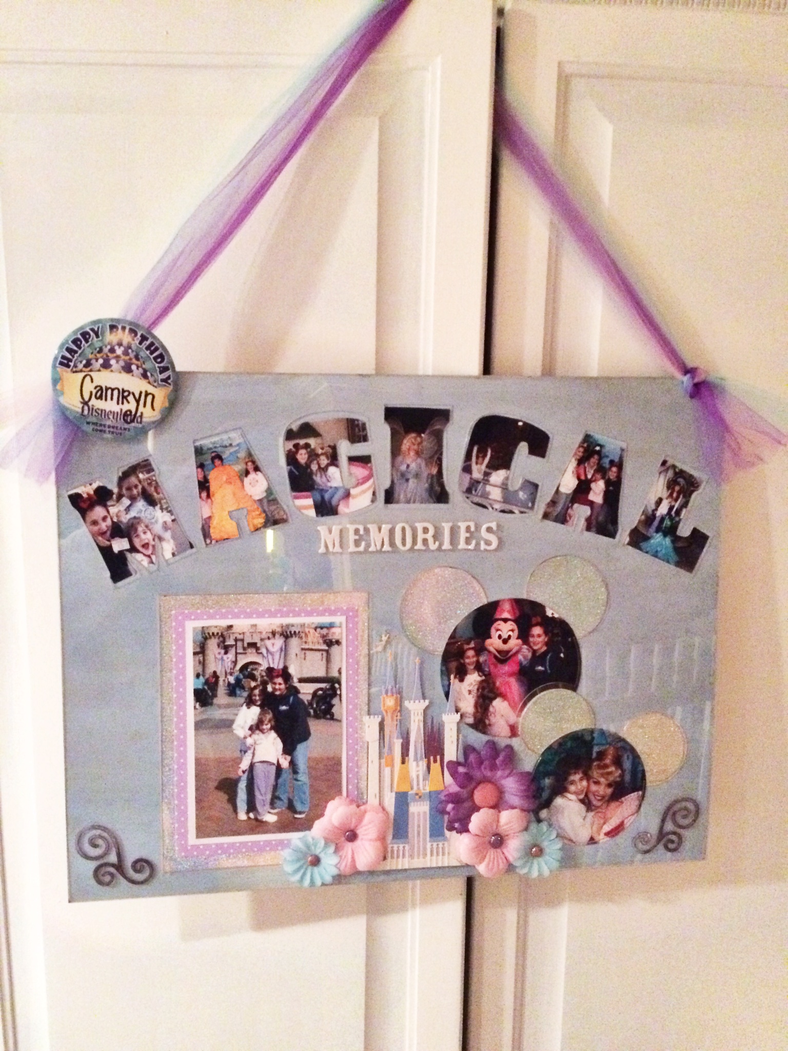 To create this fun memory piece, I painted the chipboard background with a wash of Disney Cinderella Blue. Each of the letters were traced onto the photos which I then fussy cut and glued to the chipboard. I added a Disney castle and some flowers and the swirls (which are our Flourish Embellishments misted a glittery lavendar). I punched holes through the acrylic and the chipboard with my cropodile to thread the tulle to create the hanger.
