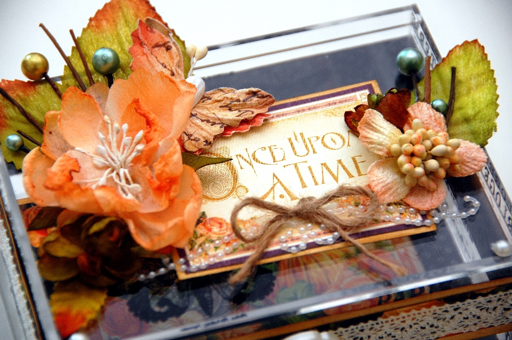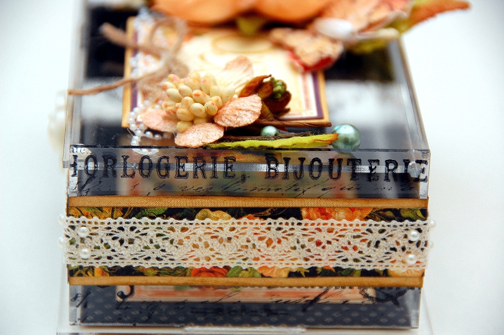 I did not put tons of stuffs on it. I add some colors using pattern papers and some soft and feminine embellishment on it. I try to kept most of the clear aspect of the acrylic boxes to maintain the elegant look of it.
