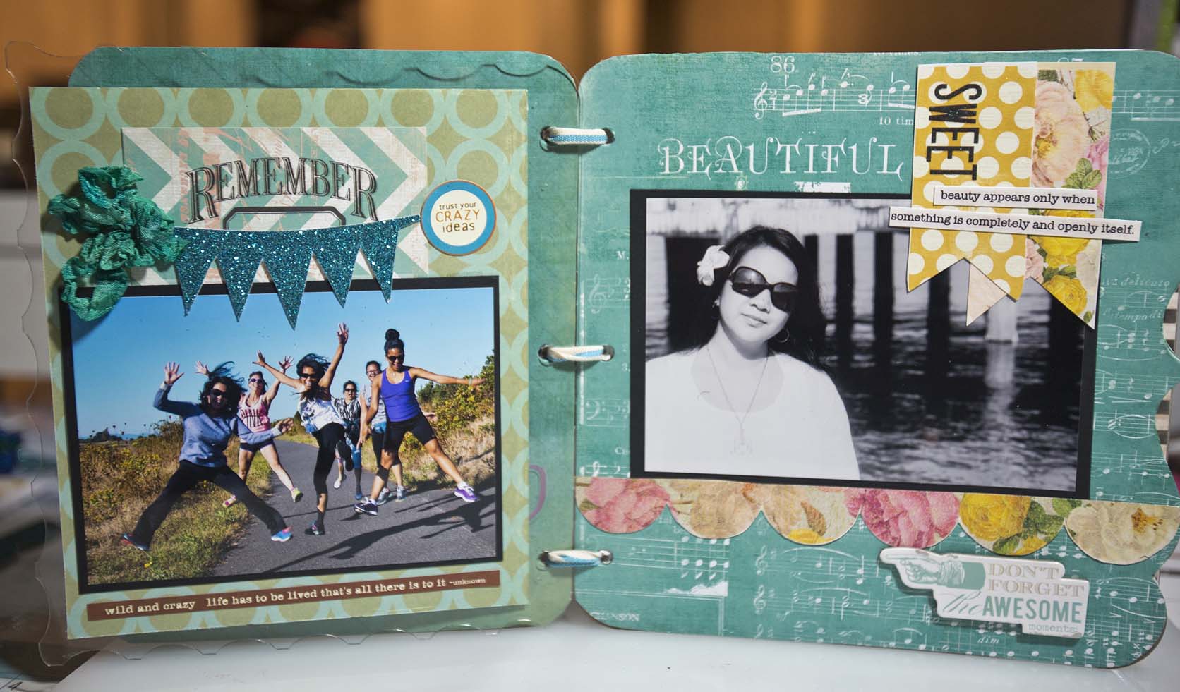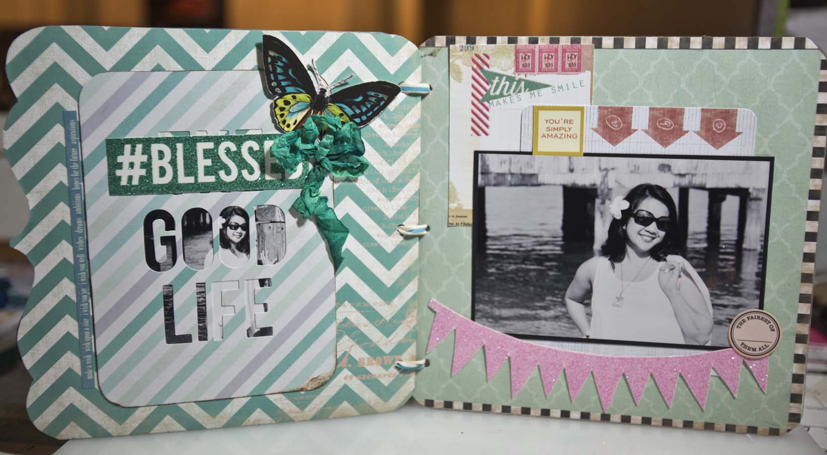I used the stencil on the front acrylic cover and add some embellishment. I arranged the first page so that the photo will see thru the front cover.