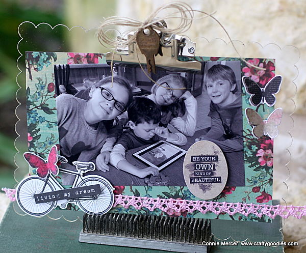 Hi, Connie here with a project using one of the new, small clipboards by Clear Scraps. For this project I used the small Scalloped Landscape Clipboard. This is so cute, actually all the clipboards are keepers!!! I decorated this one, keeping in mind, I wanted to use it as a clipboard. So with that said, here it is~