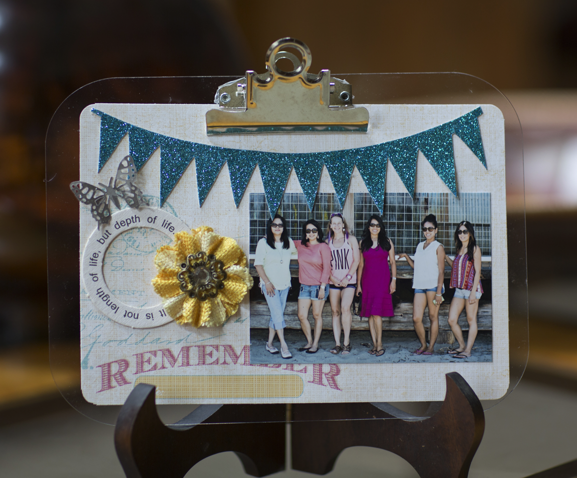 This project is fast and easy.  First – cut a patterned paper smaller than the acrylic clipboard. Use a corner rounder punch on four corners. Then  arrange and adhere the photo and embellishments  onto the patterned paper.  Then just clip the layout onto  the clipboard. To make this a refrigerator magnet, you can get magnet pad at any craft store, and add onto the back side of the acrylic.