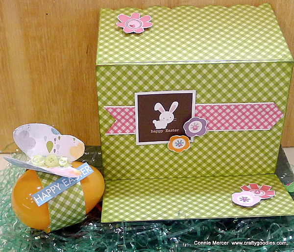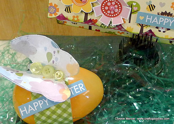 Here the card is opened! The, plastic, orange egg is decorated with an acrylic Butterfly by Clear Scraps. Clear Scraps carry all kinds of embellishments for craft projects.