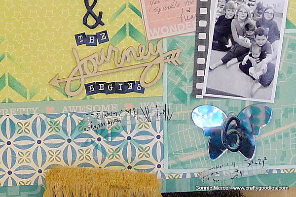 Hi, Connie here with a scrapbook page that I created using strips of paper from my scrap bin and stencils by Clear Scraps. The paper had some stains but I thought I could use it for cards or a craft project. Clear Scraps to the rescue~