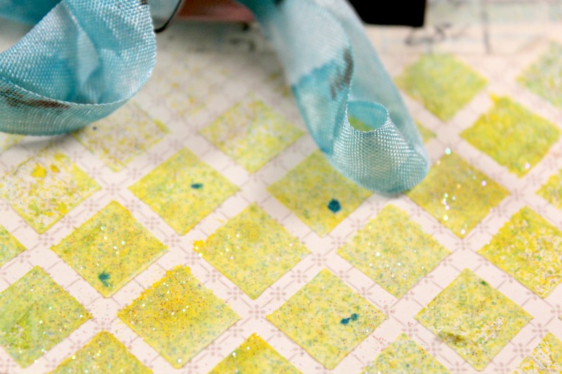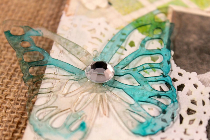 My background was created with the 6 Inch Diamonds Mascil, modeling paste, and spray ink. I have the full tutorial for the butterfly and background on my blog! Click here to see additonal pictures and instructions.