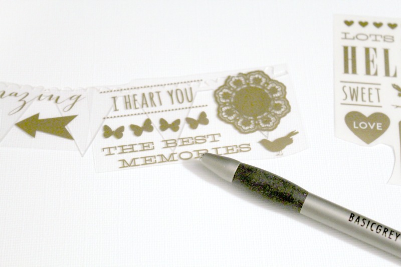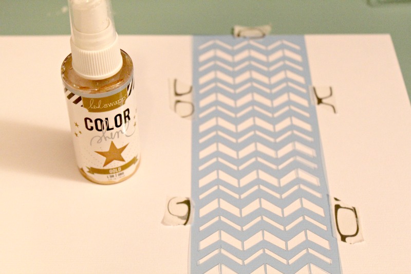 Using washi tape to secure my Border Mascil to my cardstock, I lightly misted with Gold Color Shine. I used a paper towel to lightly dab my page before lifting the Mascil off the cardstock.