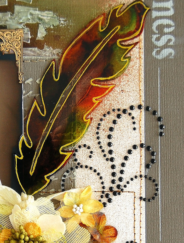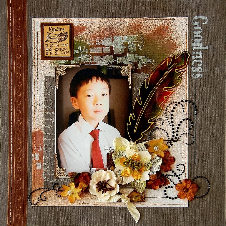 I've also used the acrylic feathers mixers by Clear Scraps to embellish this layout. I've used alcohol ink to colored it and later outlined it with permanent marker. Besides that, to create the title, I've used the "Fruit Of The Spirit" mascil and some white ink.