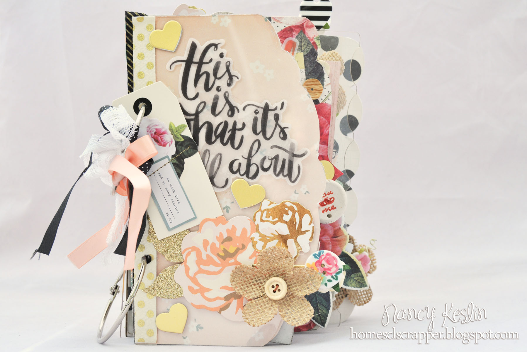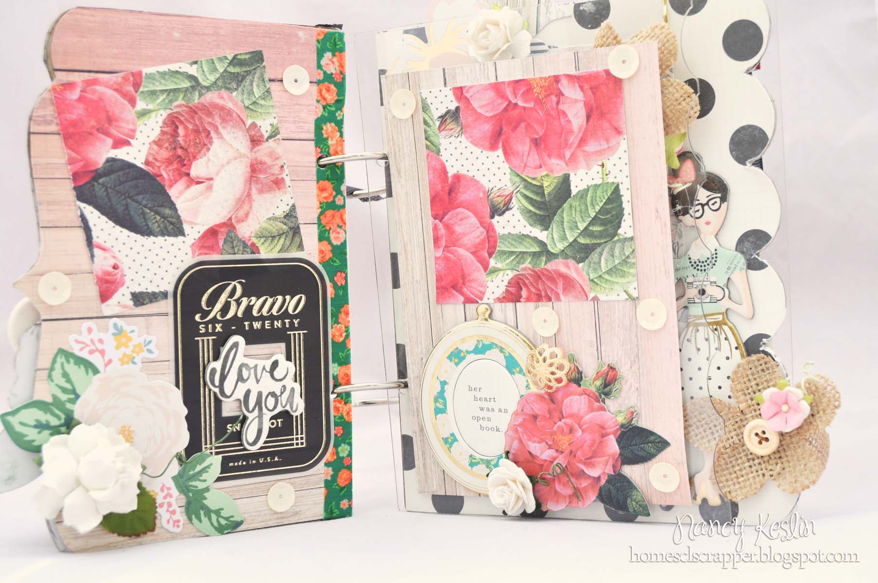 I covered the pages with beautiful papers and embelishments from Crate Paper's Open House and a few flowers. Sanding the edges of the pages makes for the perfect fit.
