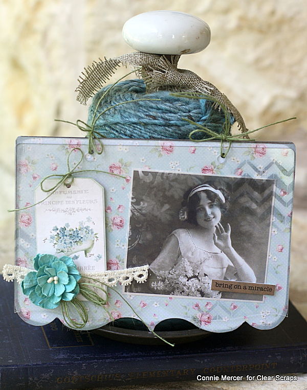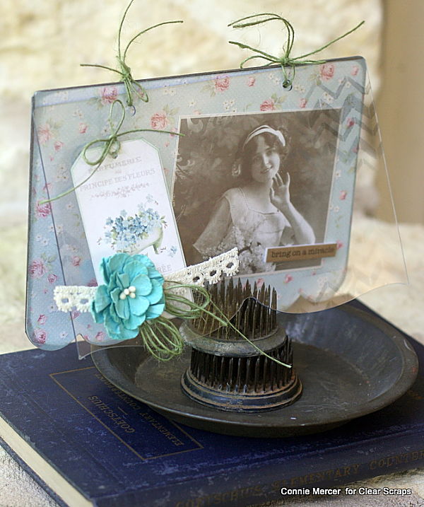 Hi, Connie here with a half chipboard, half acrylic card made from the Mixable Cutie Album by Clear Scraps. This album comes with five pages. I used the first two pages to create the card.
